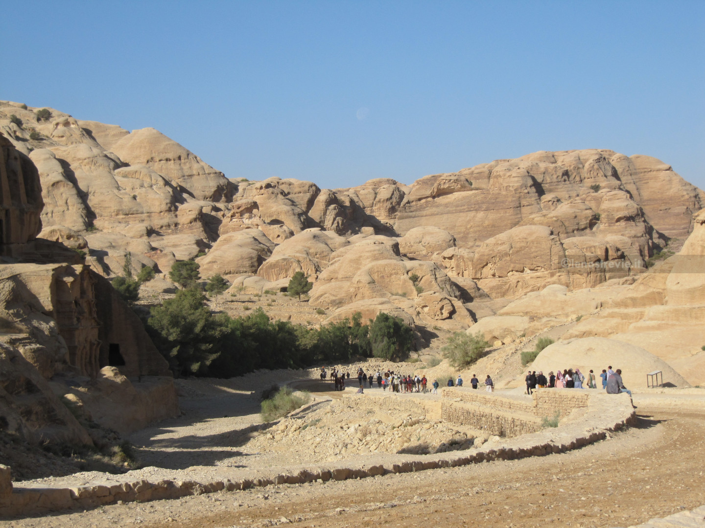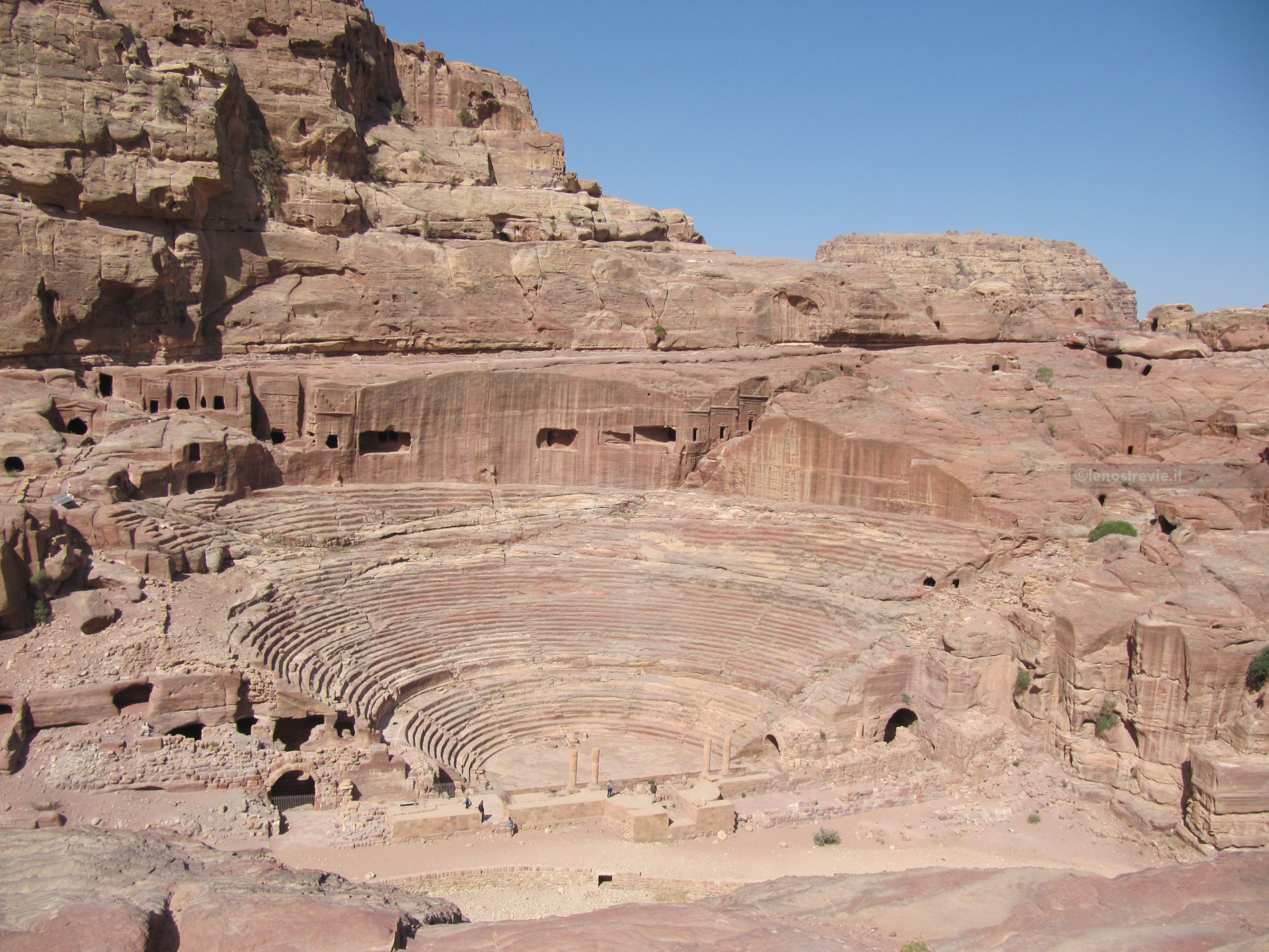 Cominciamo a meravigliarci del tempo che abbiamo impiegato, sono le 9 e siamo già a metà tragitto, le guide parlavano di ore e ore di camminata. Così cominciamo a esplorare i dintorni. Andiamo a vedere il “Teatro” (romano, intagliato nel tufo), bellissimo e facciamo una deviazione “senza guida” per vedere dall’alto. Arriviamo in cima al monte, di fronte al teatro. La vista è bellissima e si può vedere tutto il wadi e le varie spaccature nei dintorni. C’è silenzio, solo una signora anziana che accampata in uno sperone di roccia ci chiede se vogliamo un tè. Qui tutti ti offrono il tè.