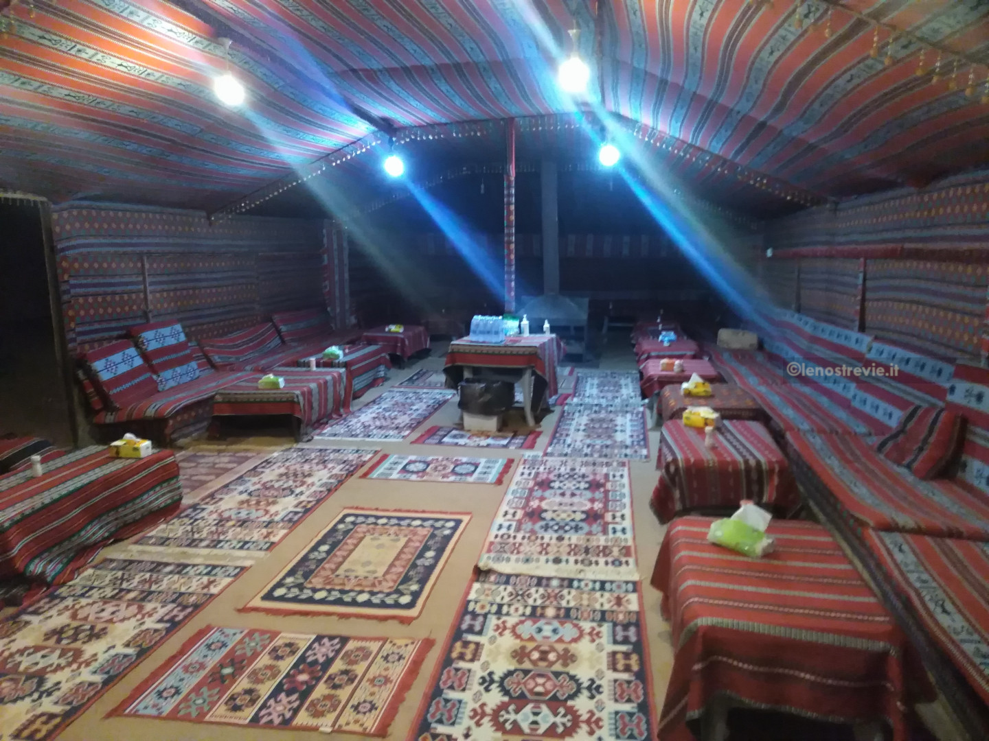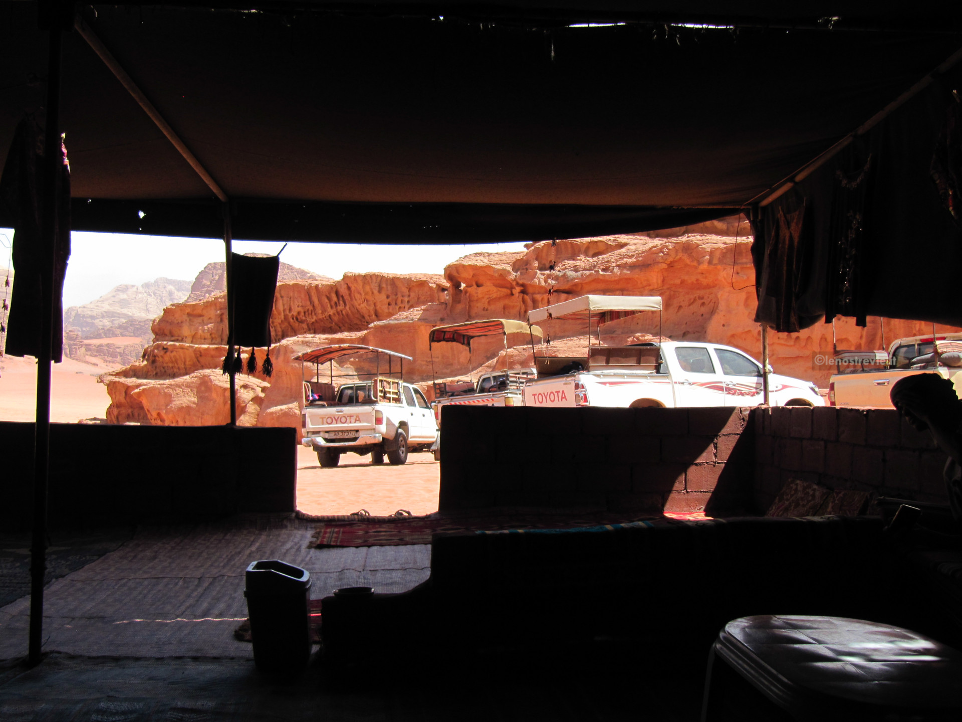 Arriviamo al nostro campo, incuneato in un lembo di deserto tra due montagne a precipizio, una decina di tende beduine e una grande tenda centrale per mangiare. Ci accoglie lo “chef” con tè e biscottini. La nostra tenda, come le altre simili, è posta su una struttura di legno che la solleva da terra e gli da stabilità, dentro è spaziosa e alta, con un letto matrimoniale.