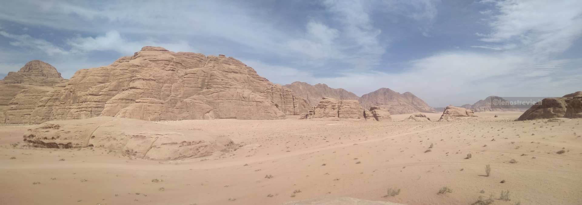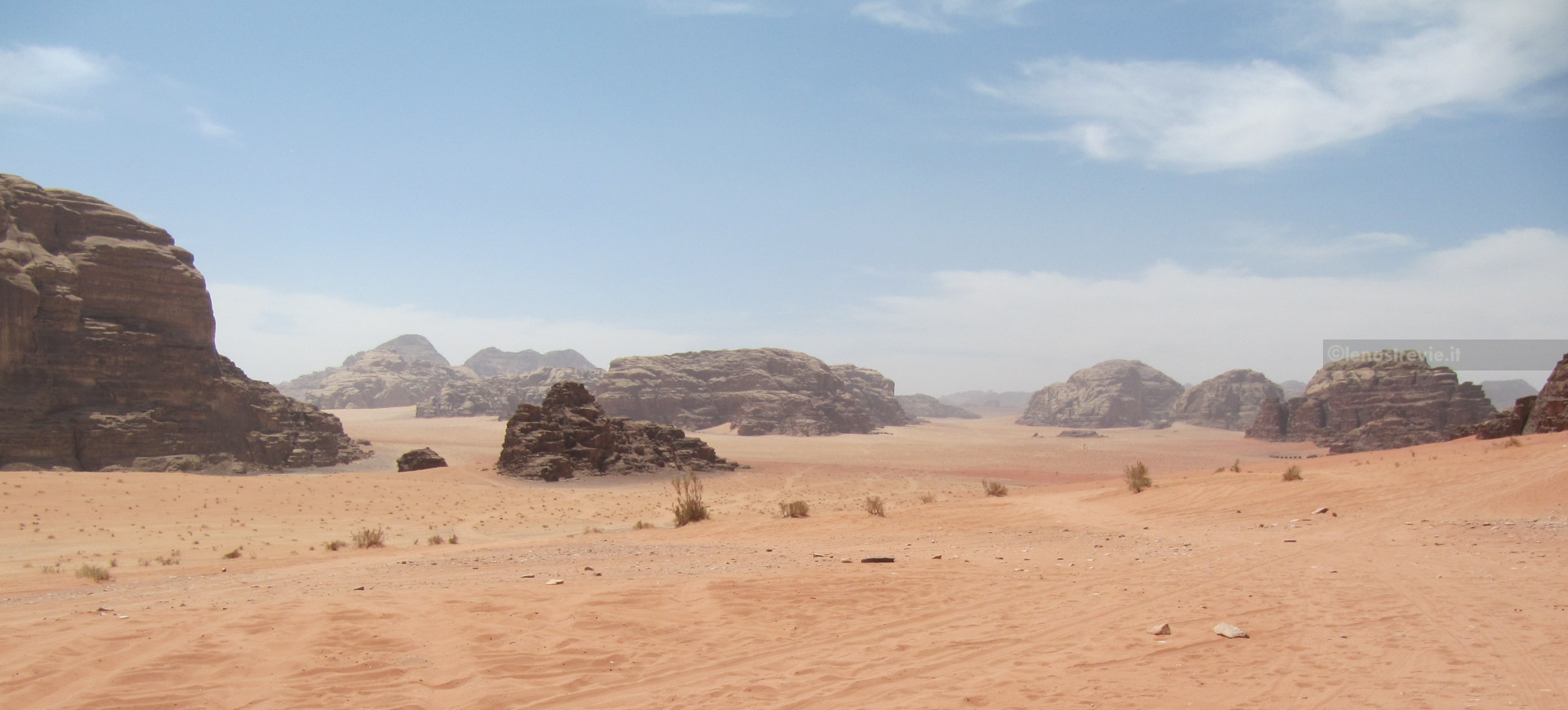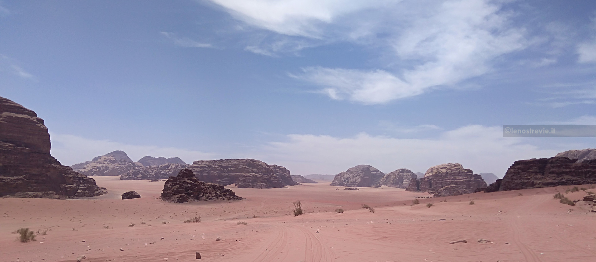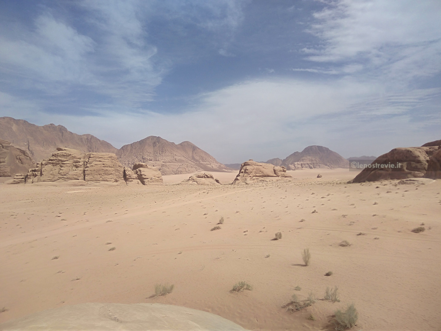 Il pomeriggio del 21 da Petra, partiamo per il Wadi Rum. La strada è liscia, e percorre un territorio vuoto fino a ricongiungersi con la Desert Highway. Qui il paesaggio cambia repentinamente, mostrandoci per la prima volta, dall’alto, il vero deserto sabbioso, bellissimo, con le sue montagne rocciose che lo caratterizzano.
