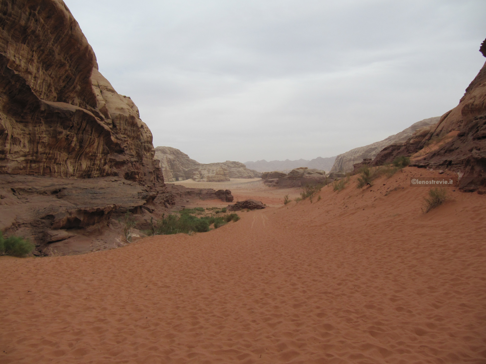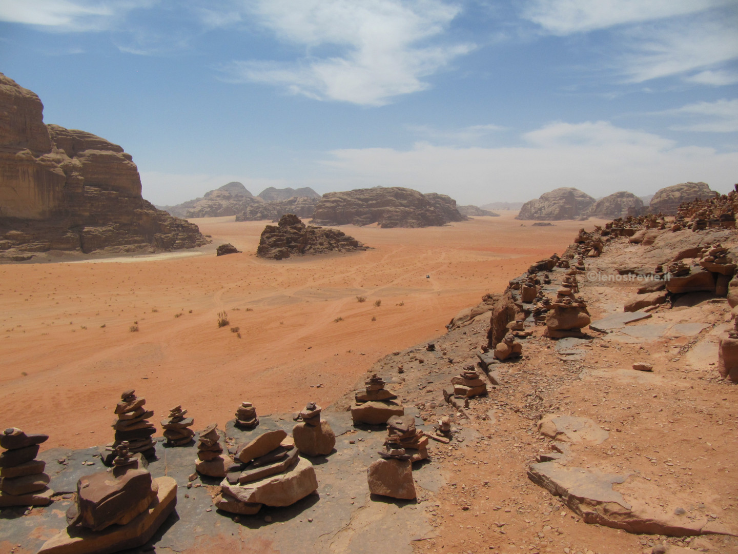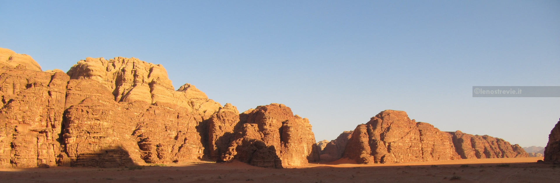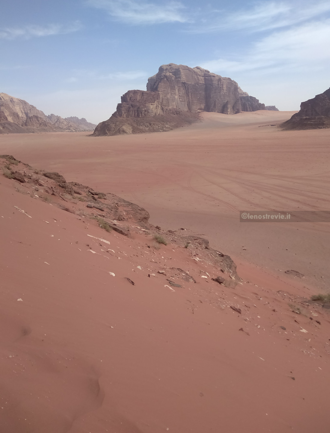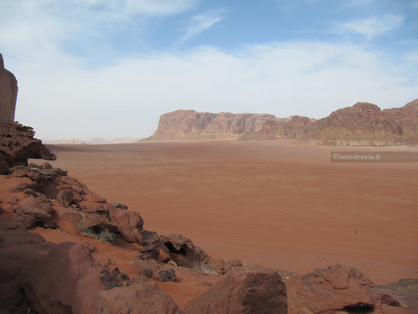 Il pomeriggio del 21 da Petra, partiamo per il Wadi Rum. La strada è liscia, e percorre un territorio vuoto fino a ricongiungersi con la Desert Highway. Qui il paesaggio cambia repentinamente, mostrandoci per la prima volta, dall’alto, il vero deserto sabbioso, bellissimo, con le sue montagne rocciose che lo caratterizzano.