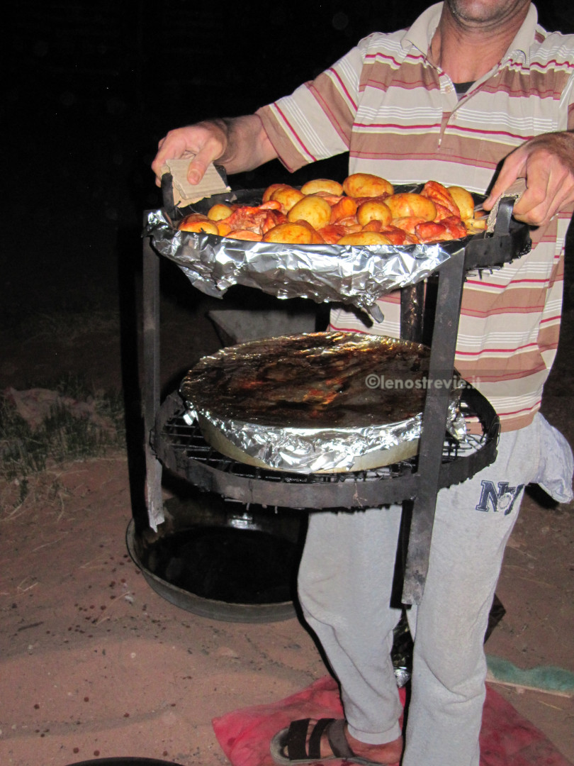 Ceniamo nell’enorme tenda comune (in 4) con altri due turisti che però andranno via domattina. Il cibo cotto nel tipico braciere sotterrato usato dai beduini. Buonissimo, pollo con verdure, tutto molto saporito, completato da dolcetti di marzapane e miele.