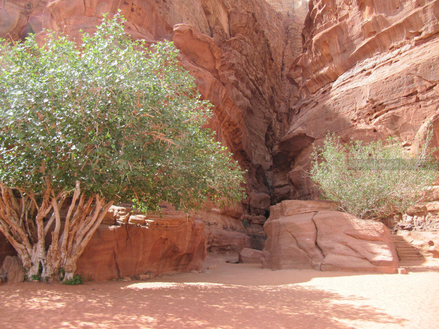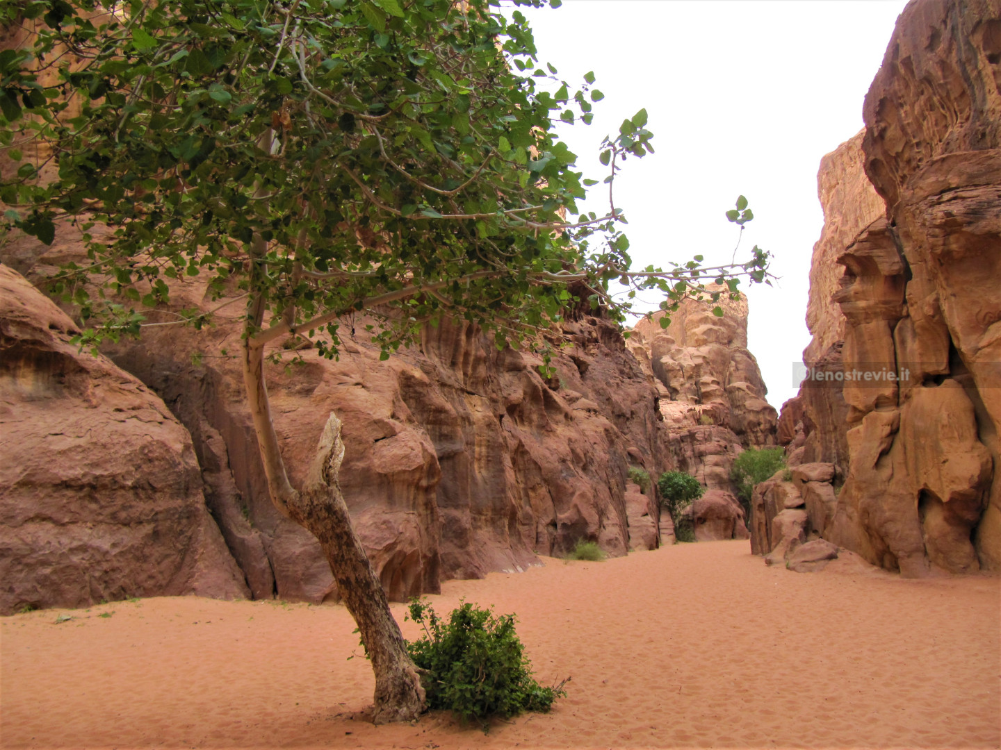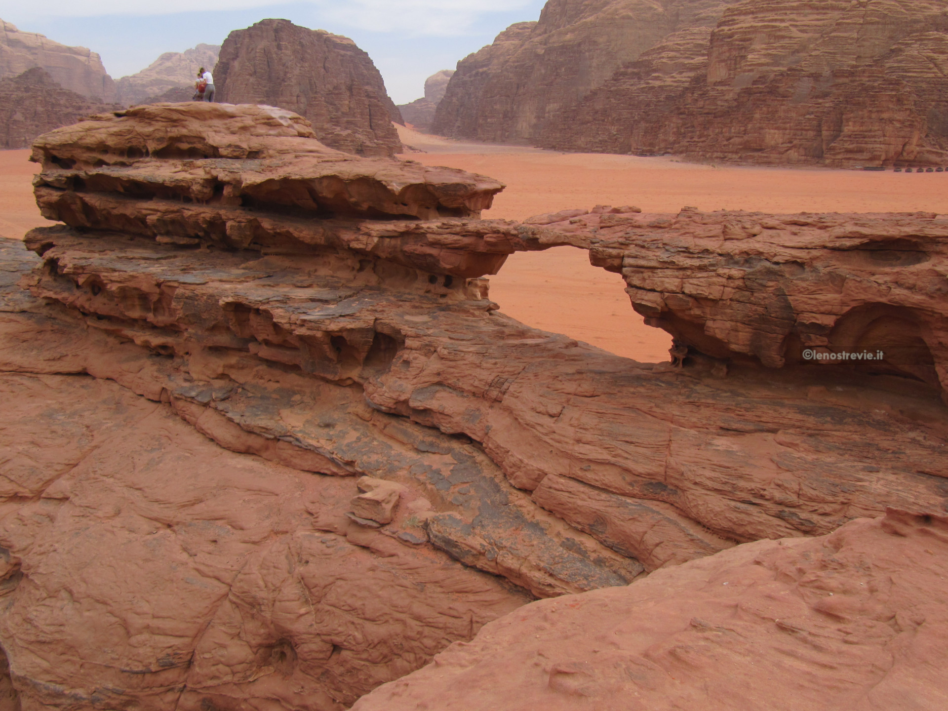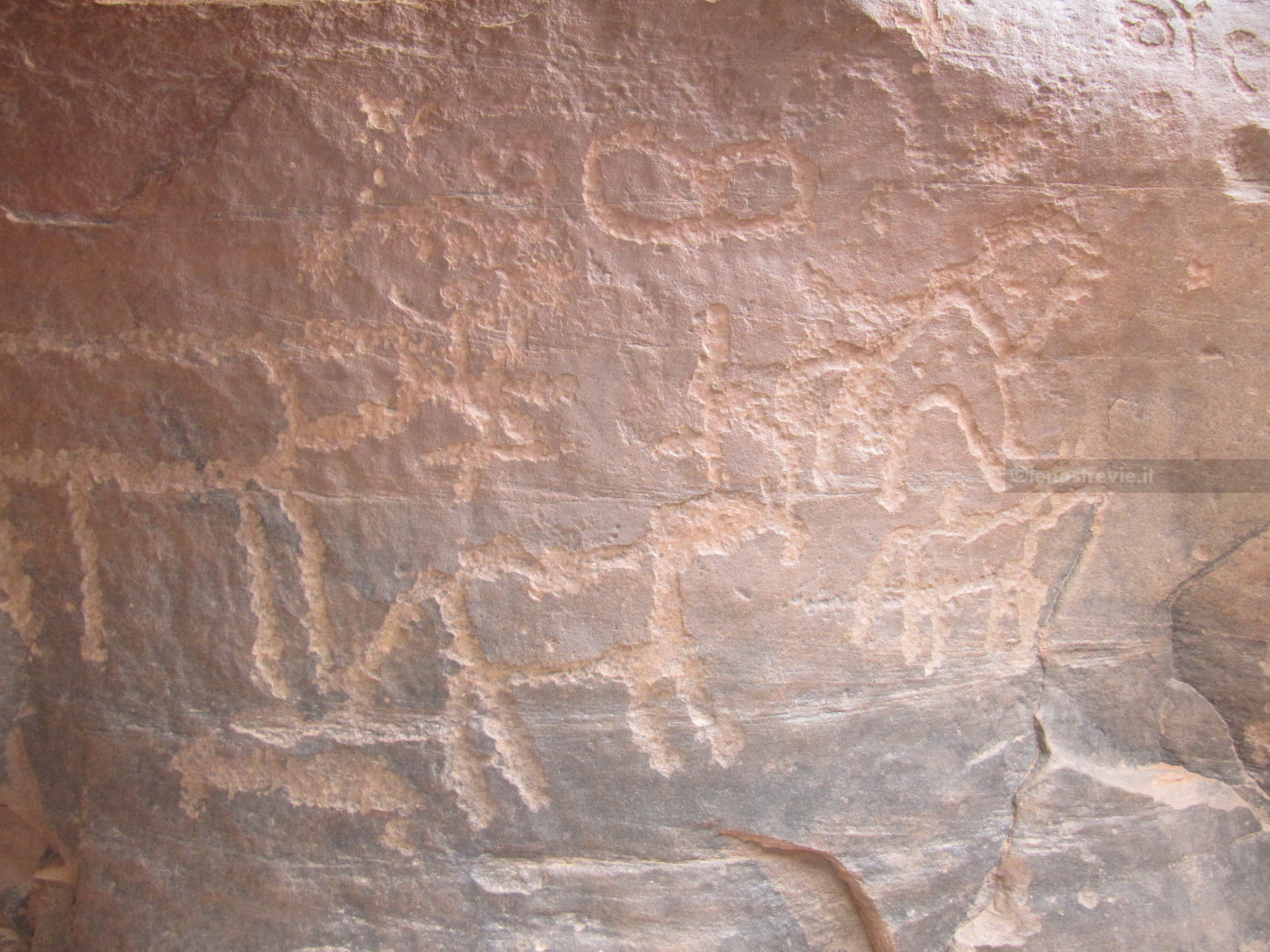 Visitiamo vari posti differenti, canyon, archi, dune e il famoso set del “Lawrence d’Arabia”, tutto bellissimo. Vediamo anche incisioni rupestri Nabatee e precedenti. Assistiamo anche a una specie di spettacolino musicale per turisti un po’ strano. Sotto il sole che è già caldo, al riparo di una tenda beduina bassa, aperta, con tappeti, si incontrano le varie guide per un tè e suonano uno strumento a arco monocorde, fatto di pelle di capra e tendine di cavallo! Ci sono molti fuoristrada e i driver si conoscono tutti.