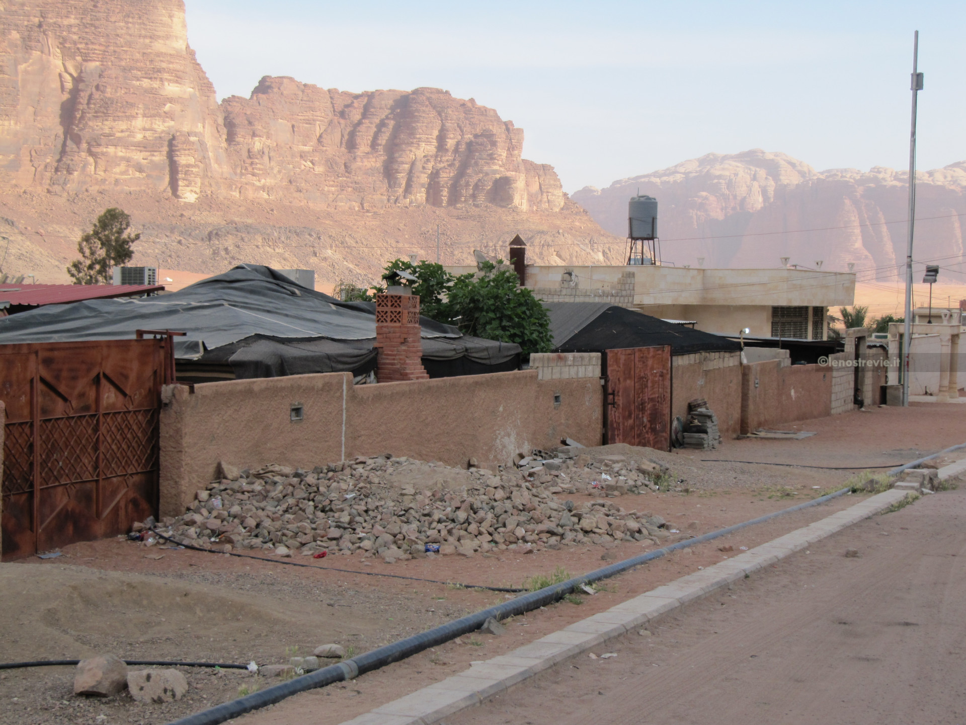 In breve arriviamo al Wadi Rum village, passando prima per una specie di check-point, dove ci chiedono la prenotazione della guida. Se non hai una guida il tuo viaggio finisce li. Il villaggio è un agglomerato di case con muri di cinta per arginare la sabbia del deserto. Qui lasciamo la nostra macchina. Dopo qualche minuto arriva un tizio, che si qualifica come fratello della nostra guida (!). Comunque conosce i nostri nomi e quindi ci affidiamo a lui e al suo fuoristrada per essere accompagnati al nostro campo.