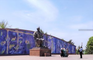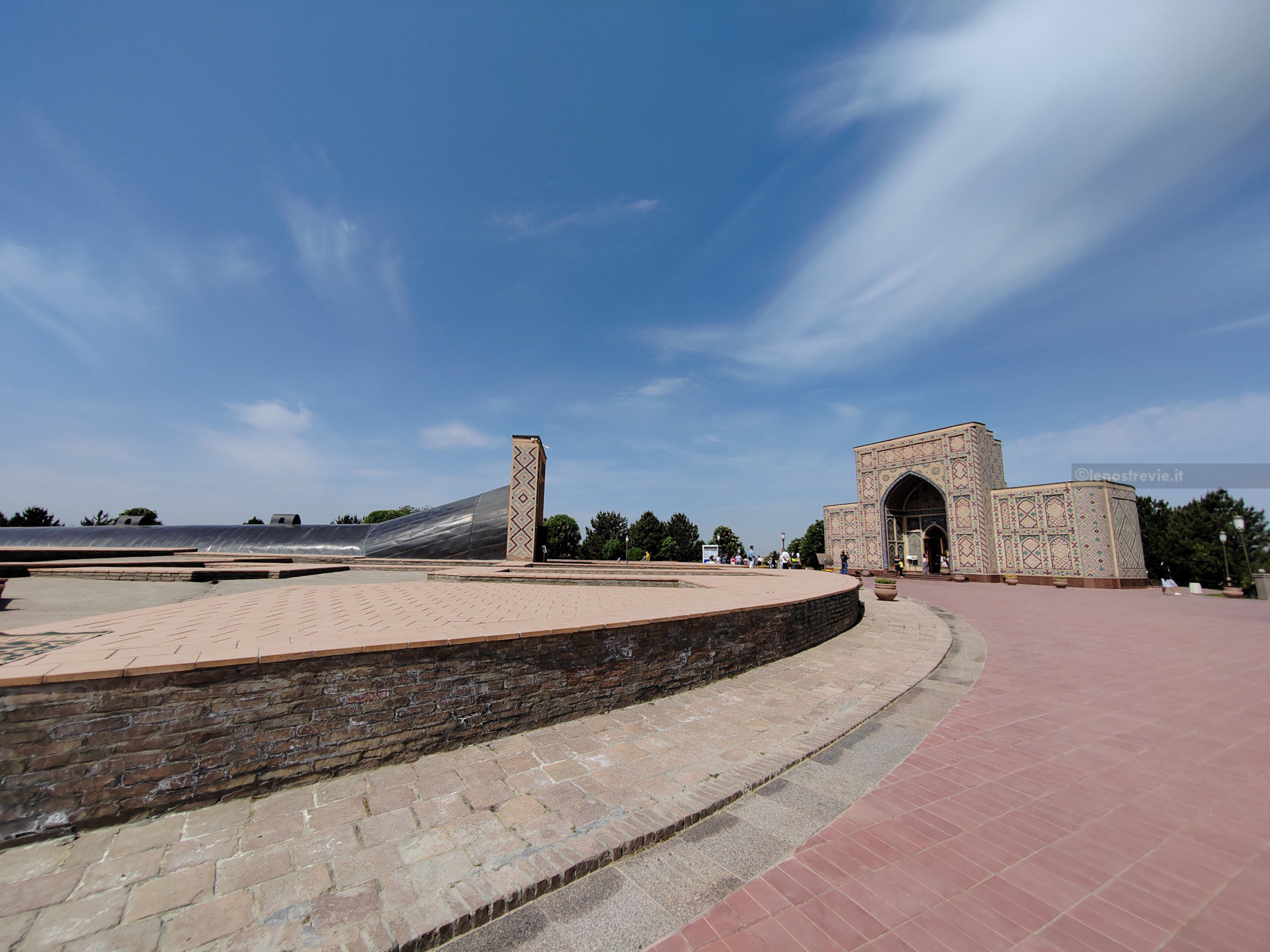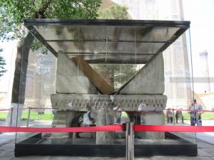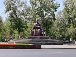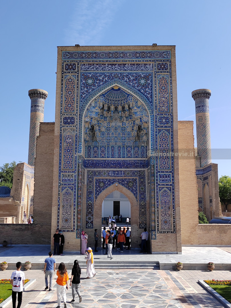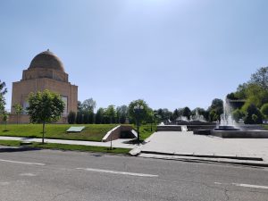 Dopo un pranzo leggero e un attimo di riposo in albergo, riprendiamo la visita della città. Ci dirigiamo verso il mausoleo di Tamerlano, percorrendo grandi strade sul bordo del “quartiere russo”. Incrociamo un’enorme statua di Tamerlano, al centro di una piazza adiacente il parco con al centro il mausoleo.