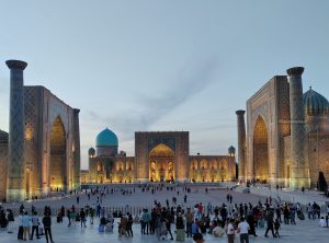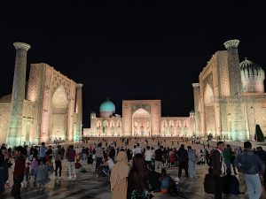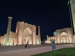 Torniamo verso l’albergo e ci godiamo il tramonto sul Registan illuminato per la notte.