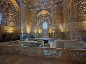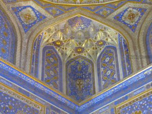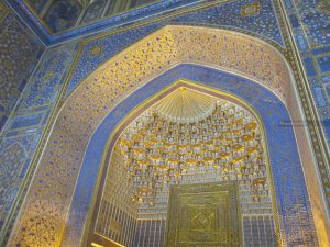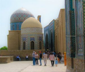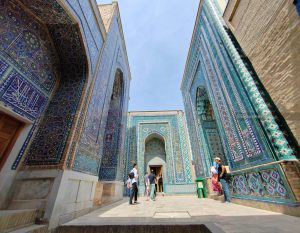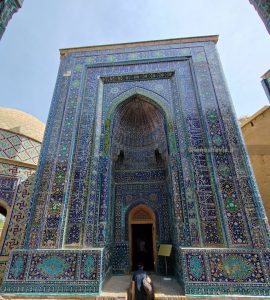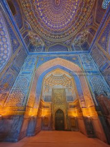 Poco distante andiamo a vedere Shah-i-Zinda, un complesso monumentale che comprende dei mausolei e altri edifici rituali dei secoli IX-XIV e XIX. Il nome Shah-i-Zinda significa “Il re vivente” e ospita i mausolei dei famigliari di Tamerlano e di altri dignitari. Un luogo che, anche se affollato di turisti locali, vale assolutamente la pena visitare. Un piccolo viale costeggiato da edifici a maioliche blu che internamente sono decorati con motivi tipici geometrici e floreali.