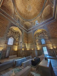 La struttura è in stile moghul; internamente è molto suggestiva: decorata in oro e blu, con lastre di pietra finemente lavorate, racchiude la tomba di Tamerlano (in giada verde scuro) circondata da quelle dei suoi familiari (in marmo bianco), tuttora onorate.