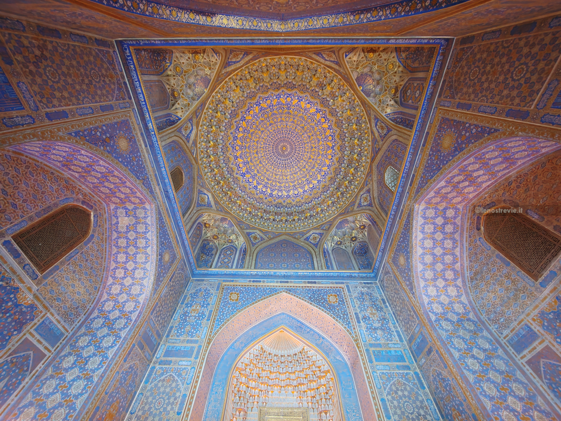 Nel Registan ogni madrasa è differente: le due laterali hanno il tipico cortile dove affacciano le celle, ora perlopiù occupato da negozietti di souvenir, mentre quella centrale, che fungeva anche da moschea, è ornata internamente con un tripudio di decorazioni oro e blu.