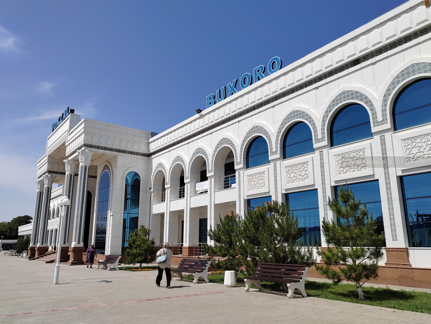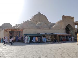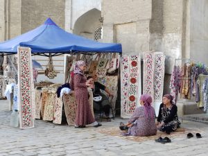 Prima di entrare cerchiamo un mercato per il pranzo: a breve distanza ne troviamo uno, tipico perché frequentato solo da locali, dove compriamo frutta e una specie di pane piatto. Sembra una focaccia ma poi si rivela una pizza di pastasfoglia schiacciata, dura ed elastica, decisamente meno buona del pane di Samarcanda. Consumiamo il pranzo nel giardino di fronte alla moschea Bolo Hauz, sotto i gelsi, che con i loro frutti hanno reso il pavimento totalmente appiccicoso. Scopriremo presto che i gelsi sono molto diffusi, ed essendo l’alimento dei bachi da seta sono ben rappresentativi dell’omonima “via della seta” che stiamo percorrendo..
