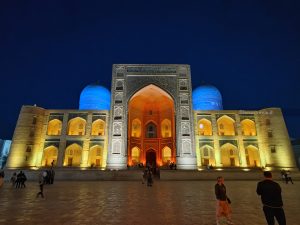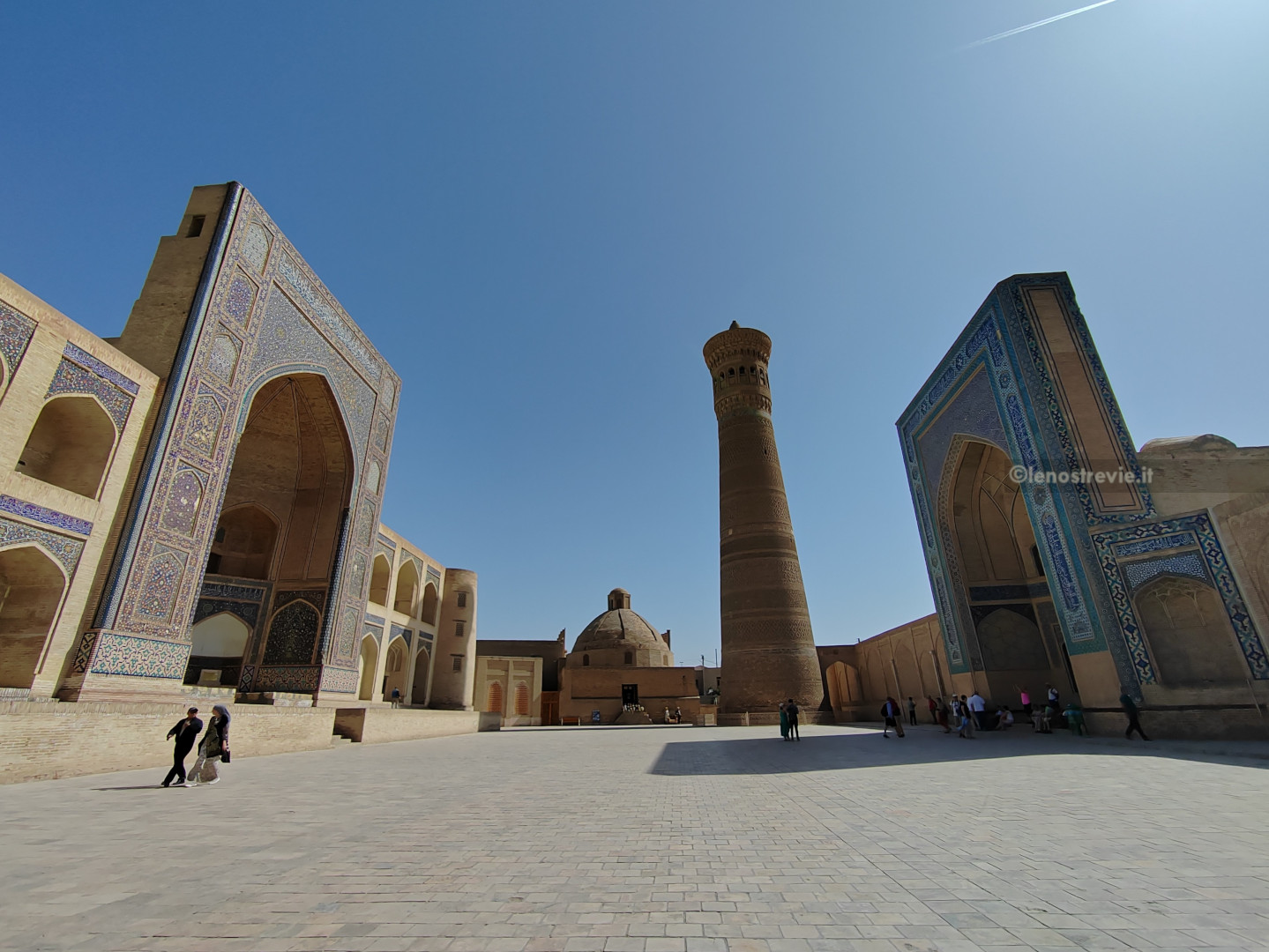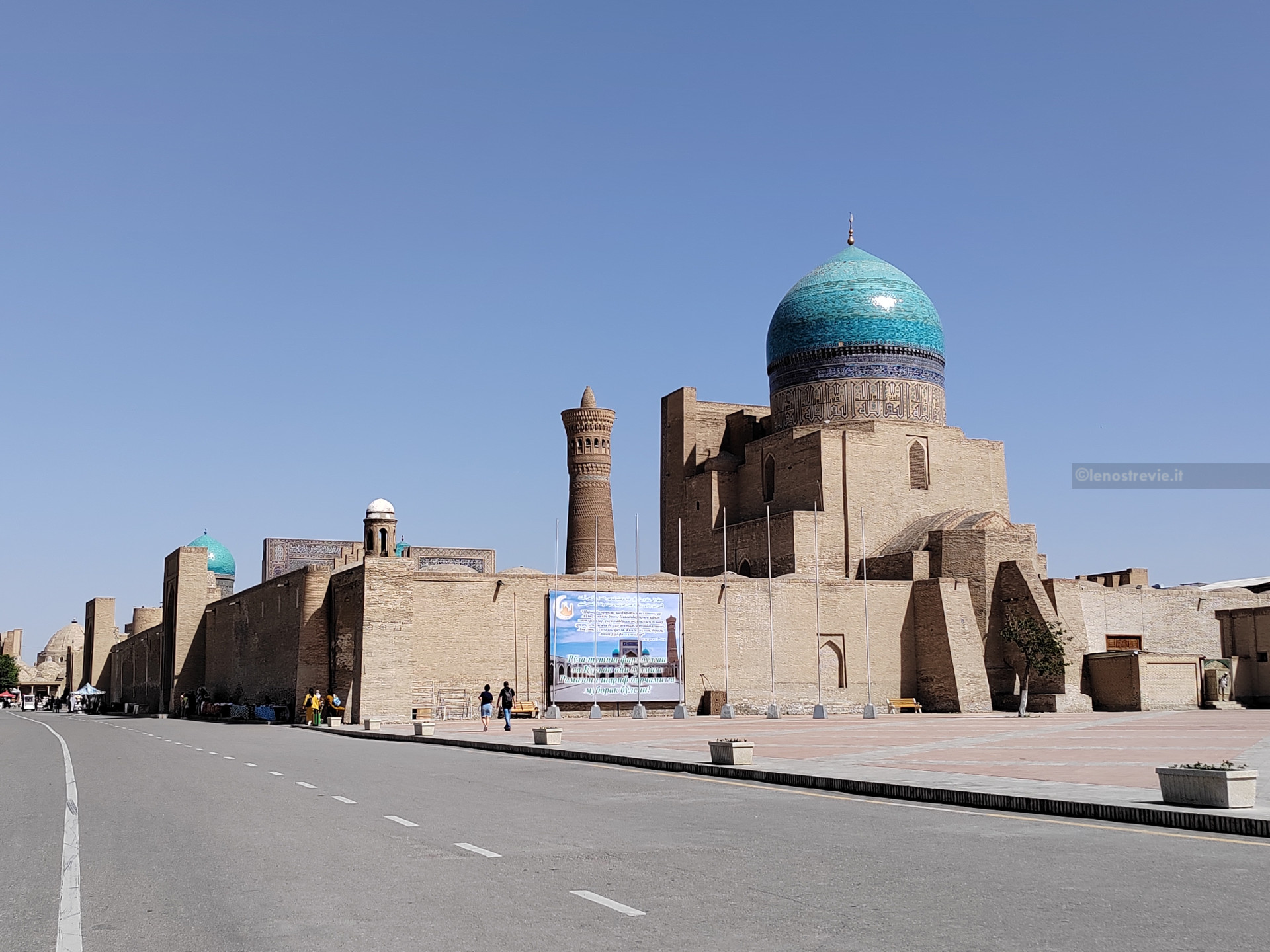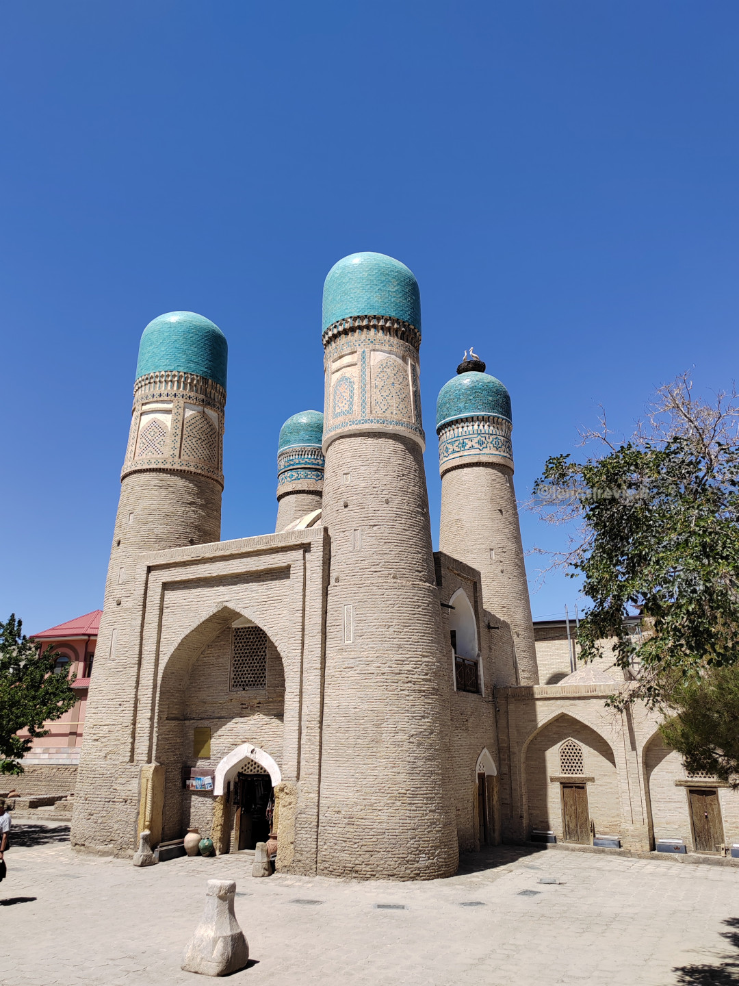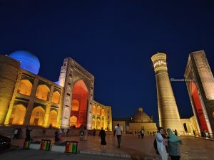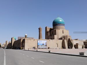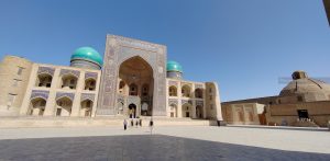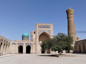 Dopo la cittadella ci dirigiamo verso la parte antica della città, proprio lì accanto, totalmente pedonale. La prima piazza è da cartolina: anche se meno imponente del Registan di Samarcanda, racchiude anch’essa un complesso di edifici, il Po-i-Kalyan, con le tipiche tre architetture: la moschea Kalyan, il minareto Kalyan, la madrasa Mir-i Arab.