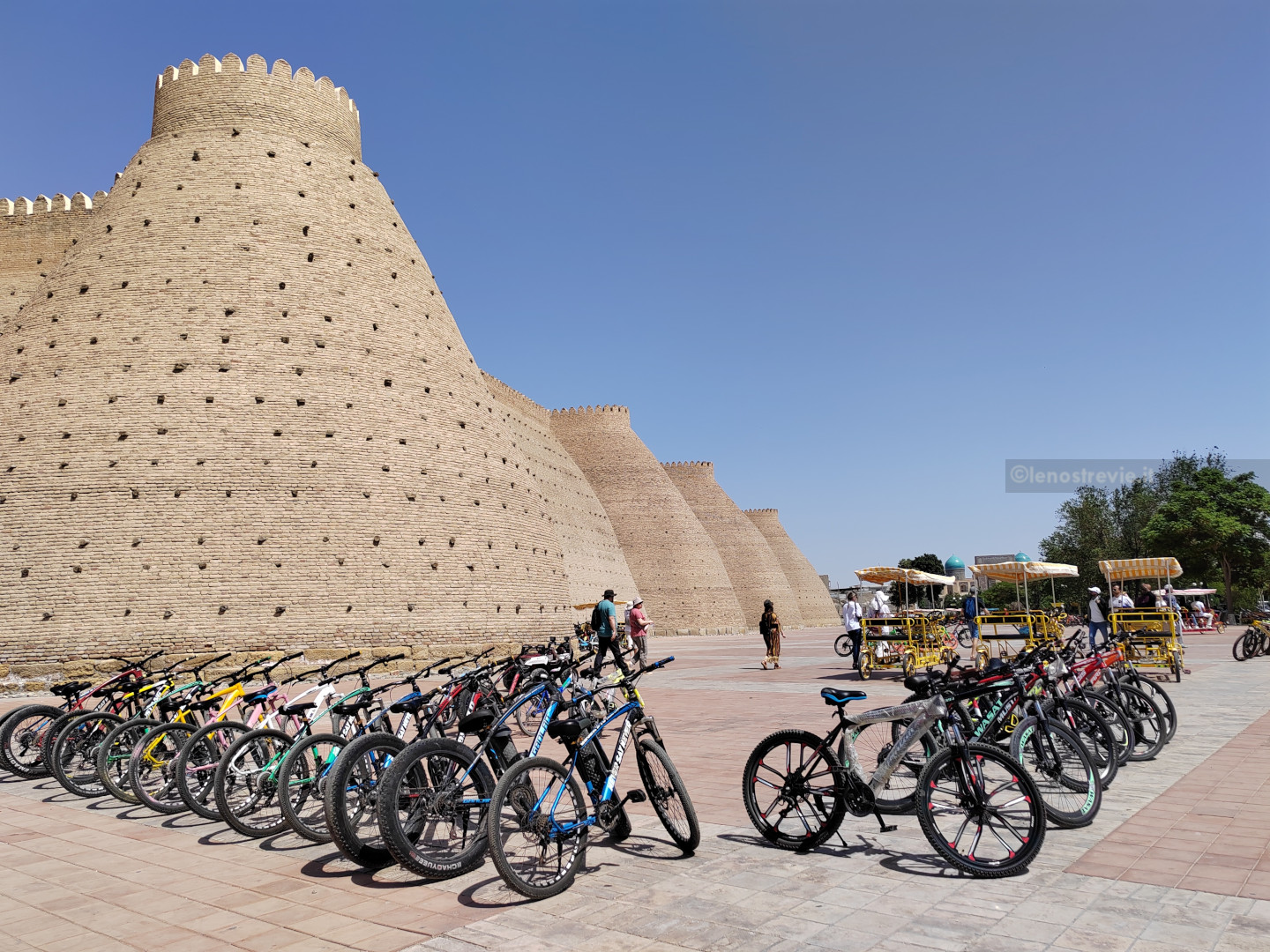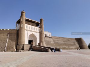 All’albergo ci ricevono cordialmente, stanza subito disponibile. Molliamo i bagagli, ci cambiamo (fa circa 30°) e usciamo. Siamo a pochi metri dall'”Ark“, un’enorme cittadella con imponenti mura punteggiate di legni sporgenti e rafforzate da bastioni tondeggianti. Risalente al V secolo, è stata residenza degli emiri (o meglio, dei khan) fino all’invasione dell’armata rossa.