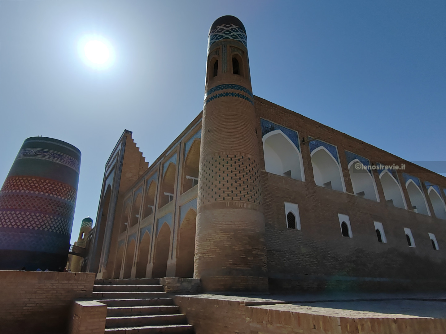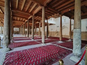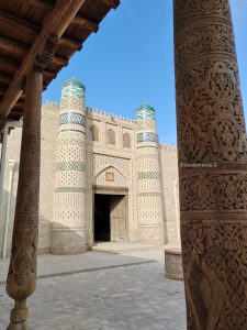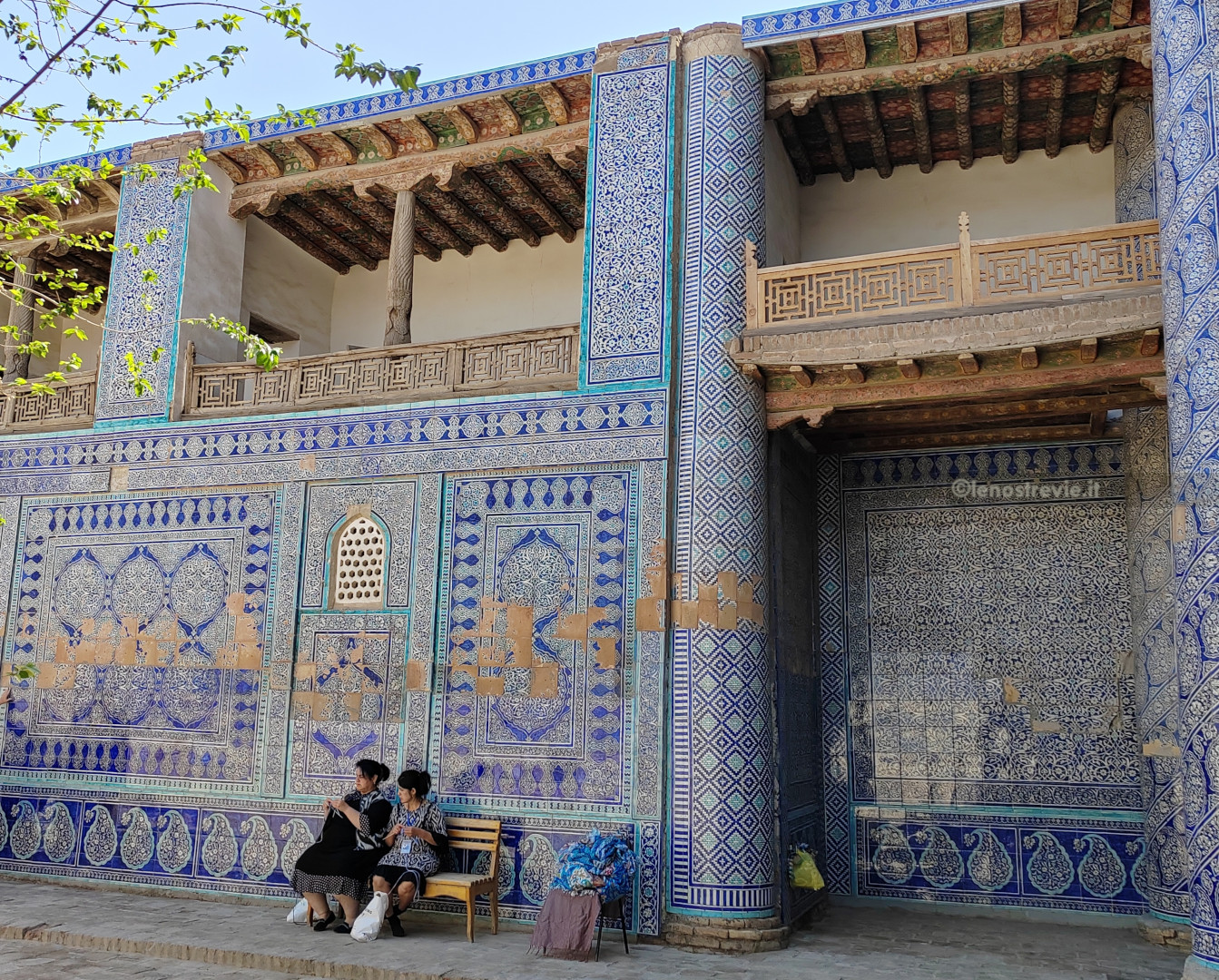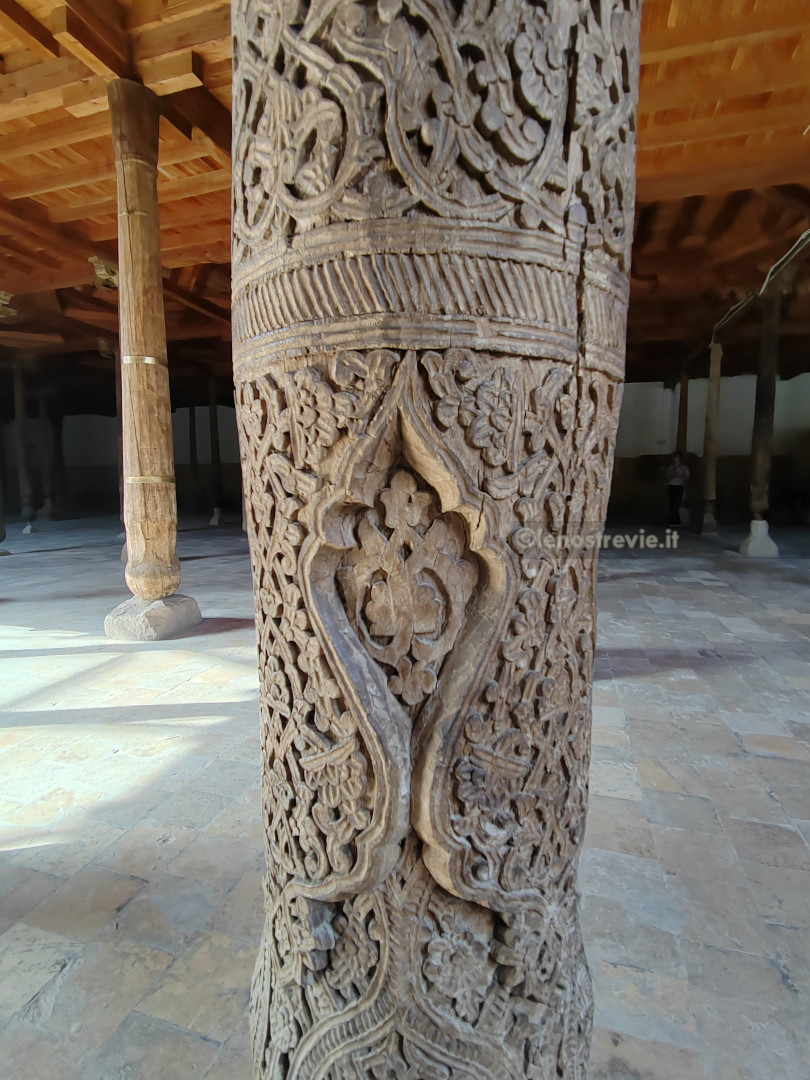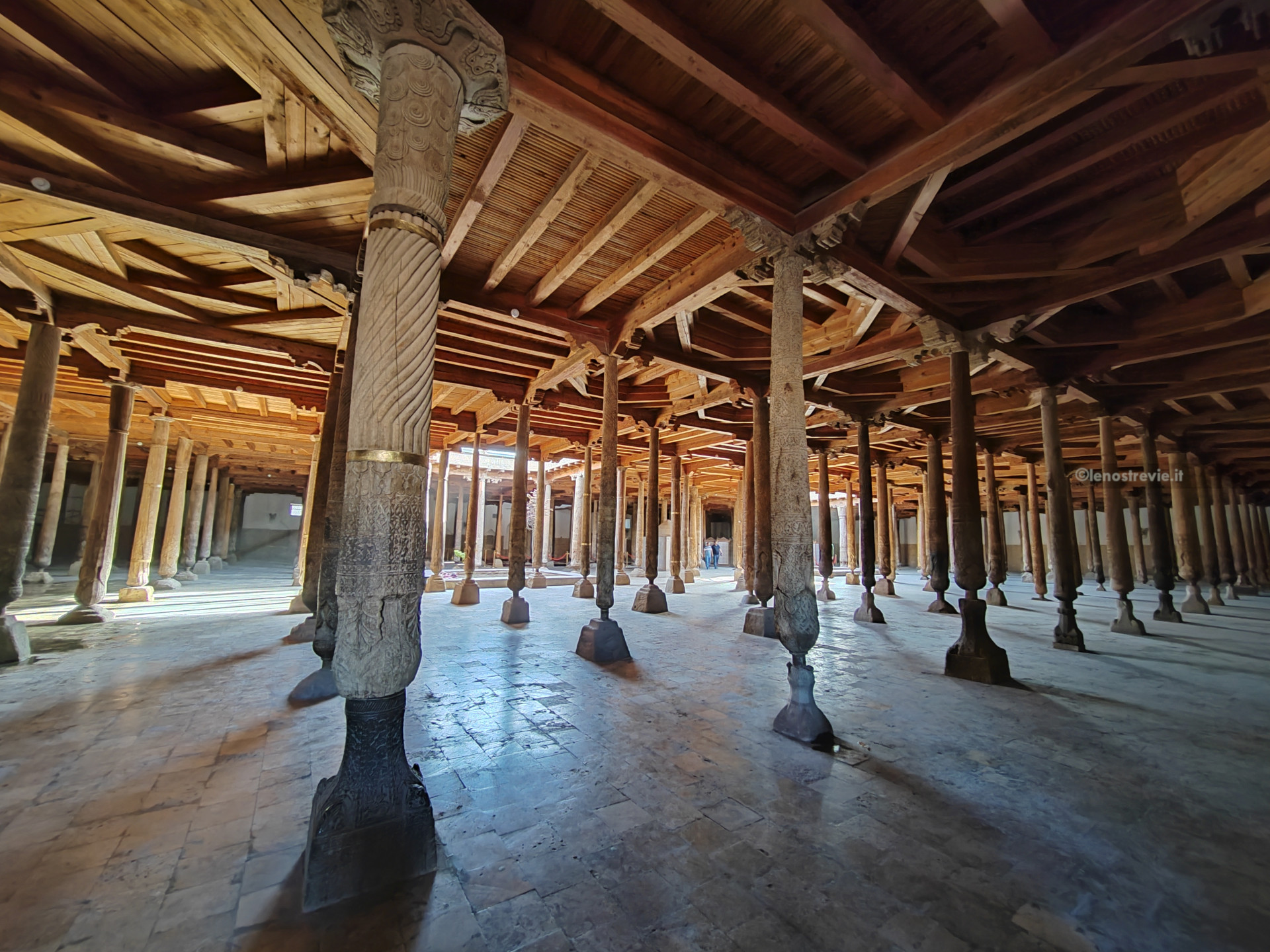 Nel palazzo Tosh-hovli, o “palazzo di pietra” costruito tra il 1830 e il 1940, le sale di attesa del Khan sono aperte e decoratissime, ma di gran lunga più piccole di quelle dei Raja indiani. Prevedono uno “spazio yurta” per accogliere gli ospiti, a conferma della cultura nomade di quella parte dell’Asia. Proseguiamo visitando madrase (tra cui una bellissima trasformata in hotel caratteristico, con “celle” trasformate in stanze con tanto di aria condizionata). Molte anche le moschee, tra cui la moschea Juma con la sua foresta di 218 colonne in legno a sostegno del tetto. Le basi delle colonne riportano incisioni in stile cufico del X-XI secolo.