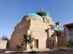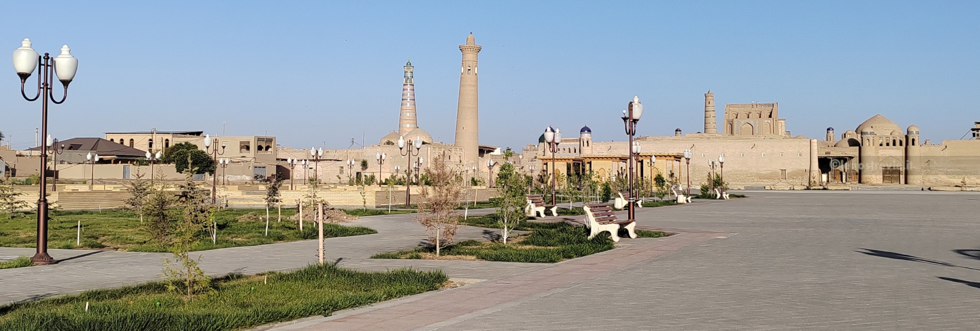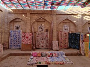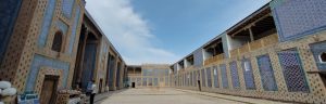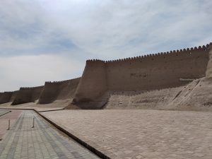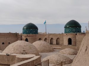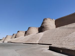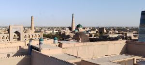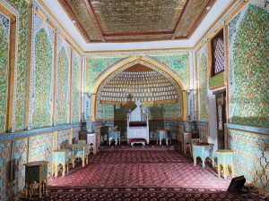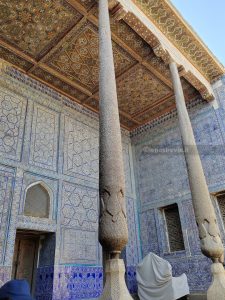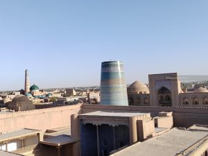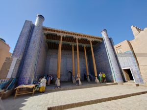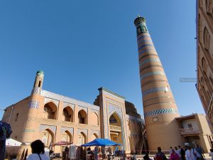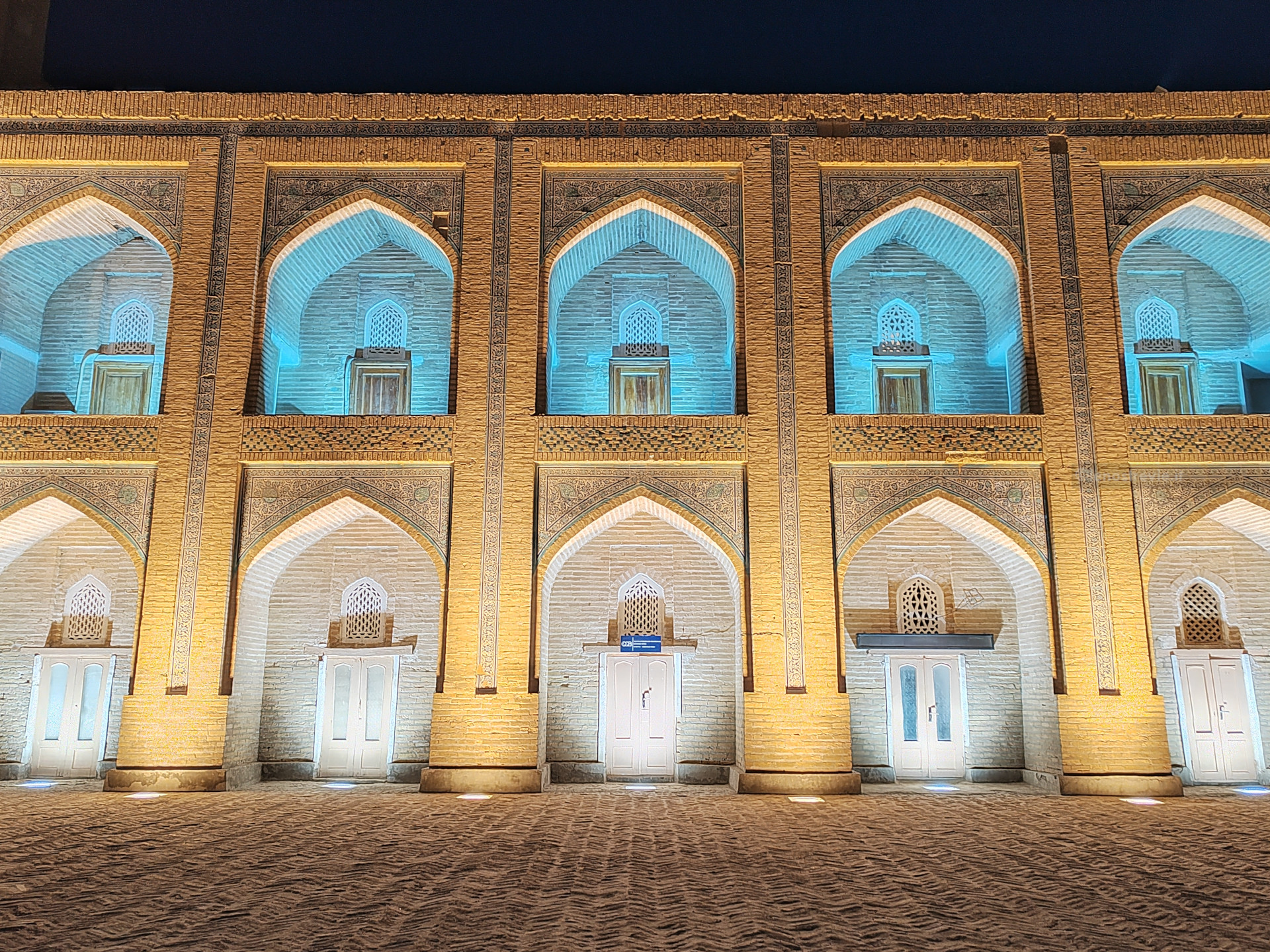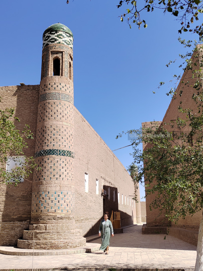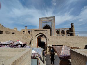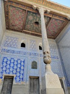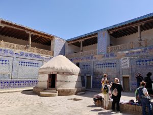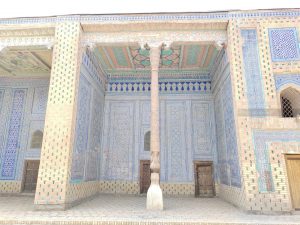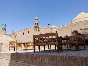 Nel palazzo Tosh-hovli, o “palazzo di pietra” costruito tra il 1830 e il 1940, le sale di attesa del Khan sono aperte e decoratissime, ma di gran lunga più piccole di quelle dei Raja indiani. Prevedono uno “spazio yurta” per accogliere gli ospiti, a conferma della cultura nomade di quella parte dell’Asia. Proseguiamo visitando madrase (tra cui una bellissima trasformata in hotel caratteristico, con “celle” trasformate in stanze con tanto di aria condizionata). Molte anche le moschee, tra cui la moschea Juma con la sua foresta di 218 colonne in legno a sostegno del tetto. Le basi delle colonne riportano incisioni in stile cufico del X-XI secolo.