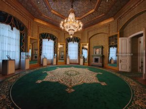 Gli interni sono un mix di oriente e occidente, con sontuose decorazioni a specchi in stile veneziano.