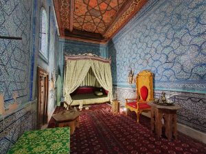 Il giorno successivo, il 28 aprile, dopo la colazione in hotel, continuiamo la visita degli edifici storici. Accediamo alla seconda ala del palazzo del Khan, con il cortile riservato all’harem, estremamente decorato nelle facciate ma con decori ancor più appariscenti all’interno. Fu la prima parte del palazzo ad essere costruita, ed è suddivisa in cinque logge, ciascuna sostenuta da un pilastro di legno intagliato, assegnate alle quattro mogli legittime del Khan e al Khan stesso.