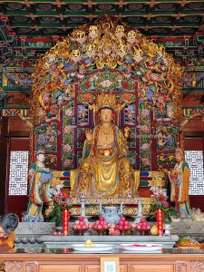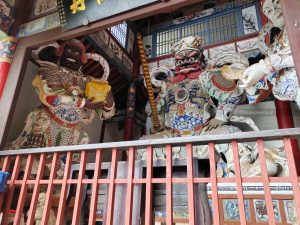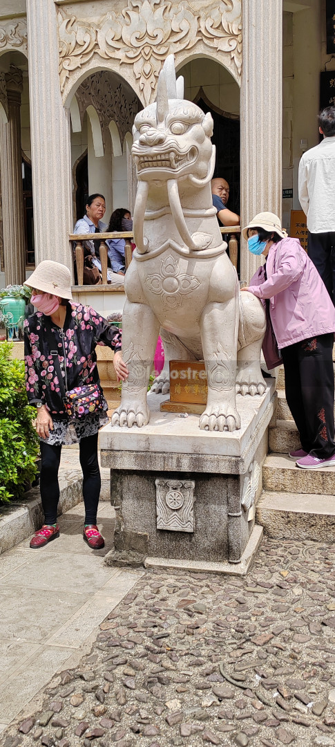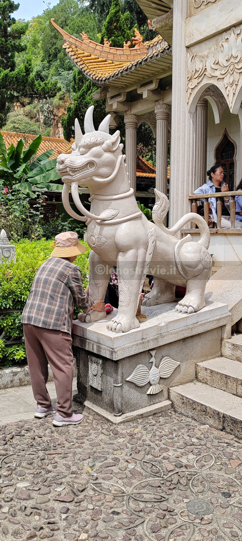 Di fronte a una cappella, notiamo due statue di draghi di marmo bianco (guardiani), venerati come se fossero taumaturgici. Diverse donne toccano le statue e si toccano il punto corrispondente come per trasferire energia o un qualche influsso benefico.