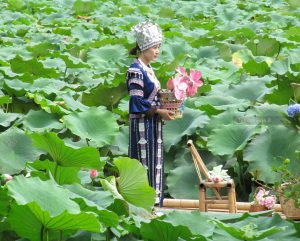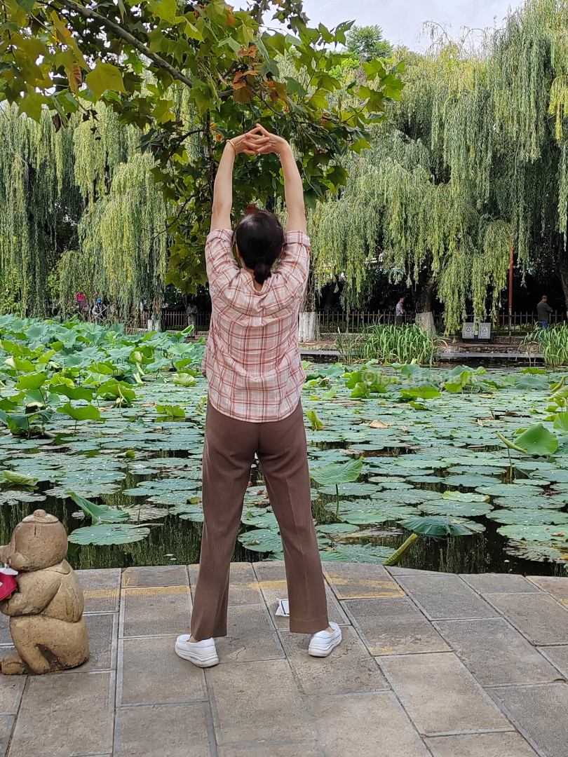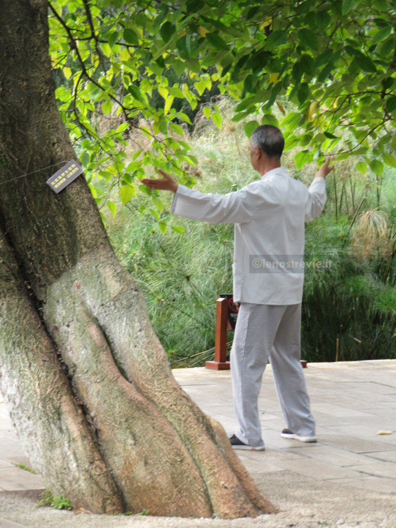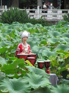 Il parco è frequentatissimo: oltre alle tante famiglie, persone impegnate in esercizi di Tai-Chi, e ragazze intente a posare per un servizio fotografico in costume tradizionale, in mezzo al laghetto dei fiori di loto, in pose impossibili (vedi la suonatrice di tamburo nell’acqua…)