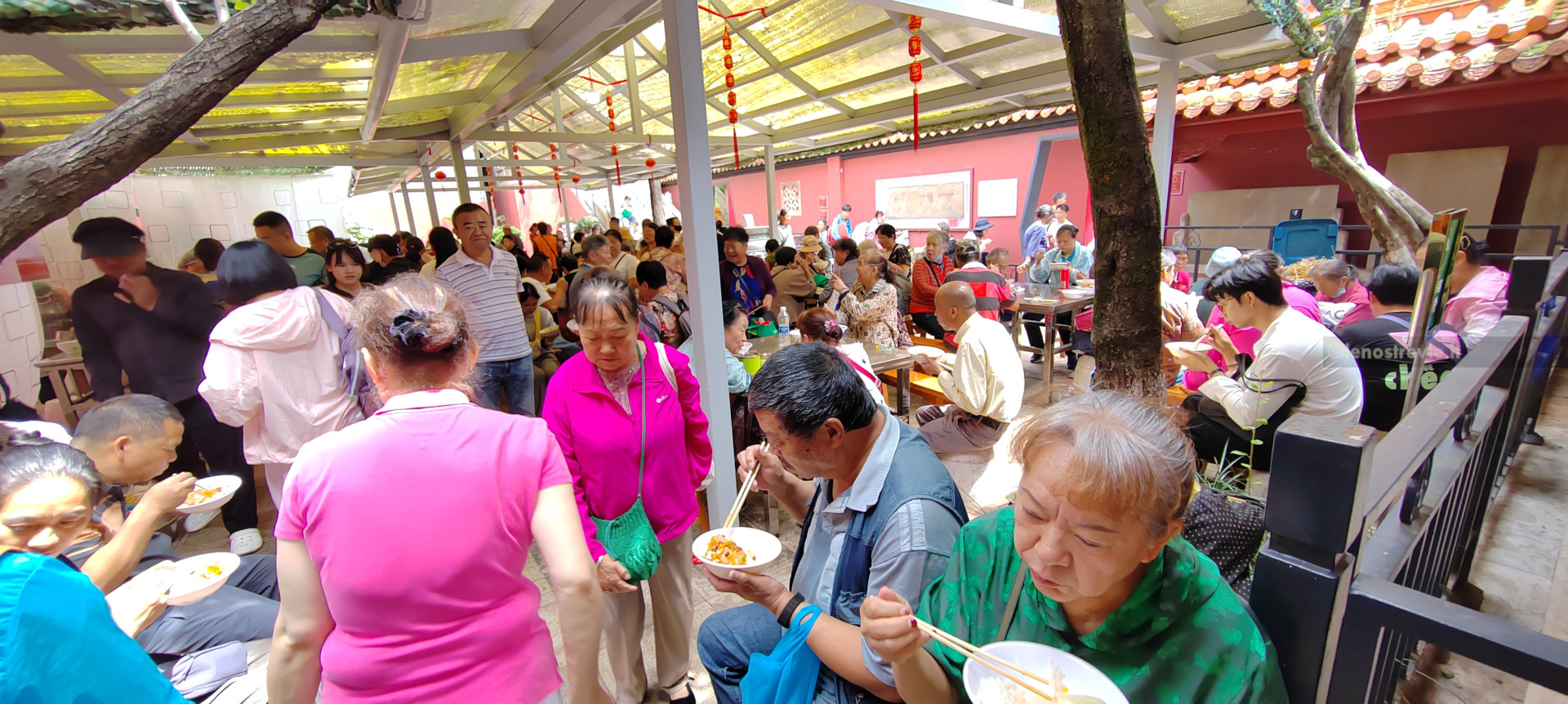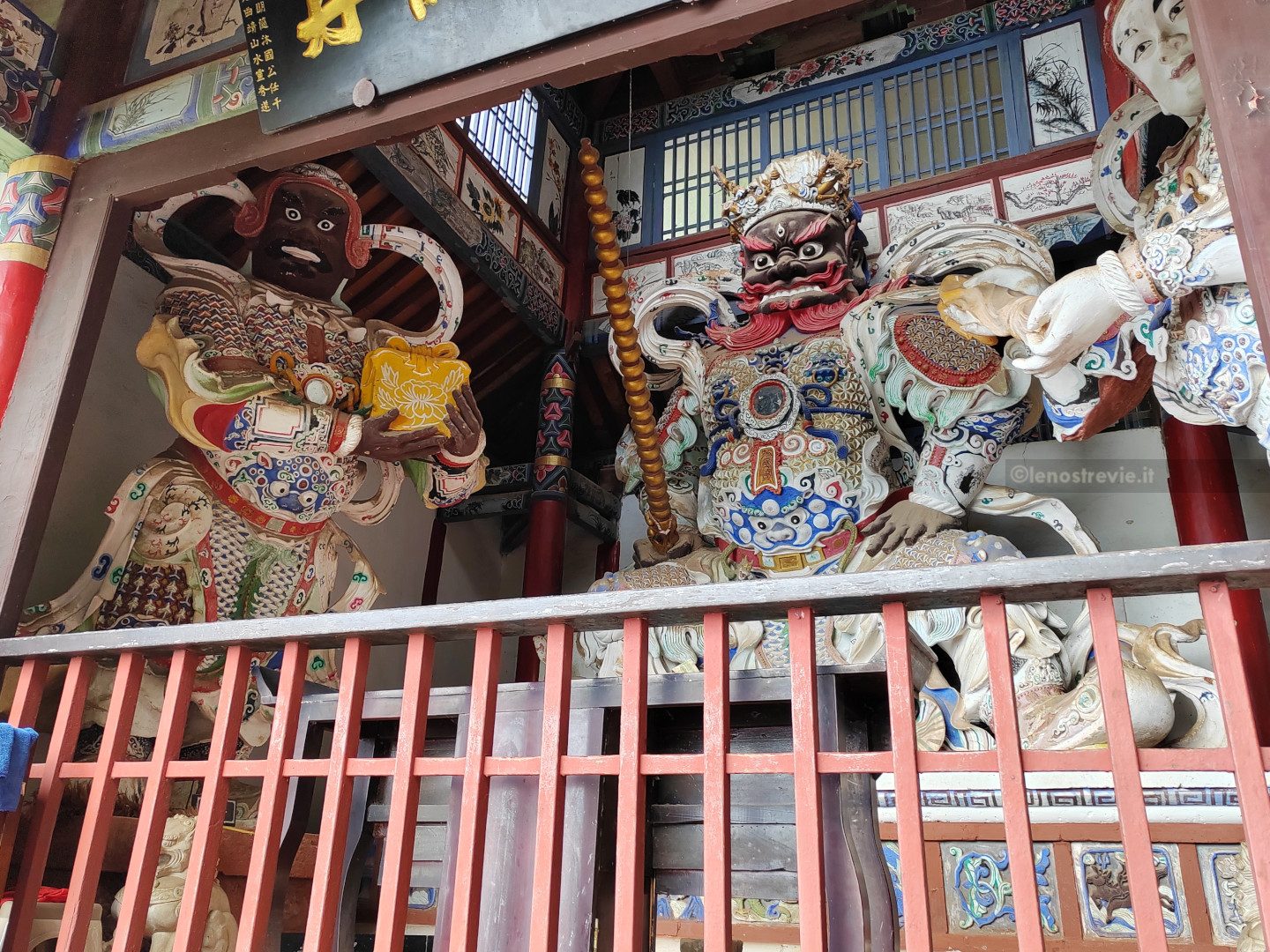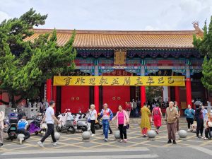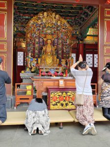 Successivamente scopriamo che è la festa del Zhongyuan (taoista) o Ullambana (buddista), ovvero la festa dei fantasmi o degli “spiriti affamati”. E’ una ricorrenza in cui nei templi si bruciano offerte e si imbandiscono tavolate per gli spiriti sconosciuti. Così incontriamo incensieri, banchetti per scrivere preghiere, templi con devoti buddisti intenti a pregare, e un capannone adibito a mensa, dove pare che si possa mangiare gratuitamente. Noi ci asteniamo per rispetto.