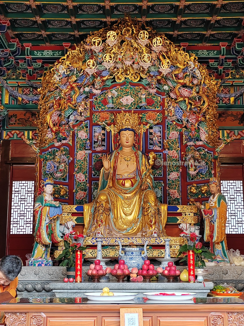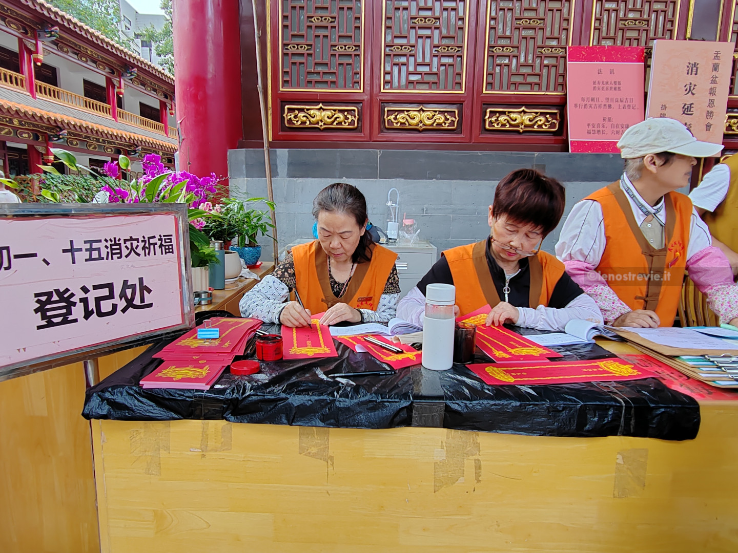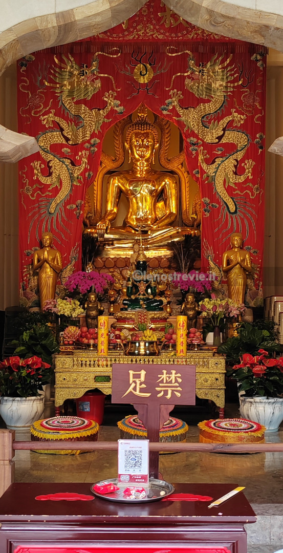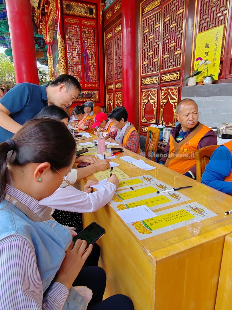 Il tempio è composto, anche qui, da vari edifici in successione, circondati da porticati. Troviamo tantissime persone (non turisti) impegnate in vari rituali religiosi: preghiere con gran profusione di incenso nei vari tempietti, ma anche trascrizione di preghiere su cartoncini (ad opera di volontari amanuensi!) affinché possano essere esposte al vento che le farà arrivare fino in cielo (pratica tipica del buddismo tibetano).