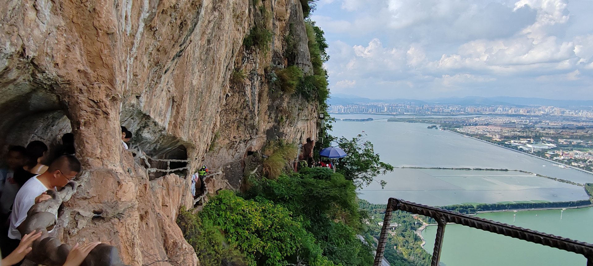 Quando si arriva sul posto, è tutto superorganizzato. Sembra che il percorso sia lungo e difficile, ma come al solito i cinesi sono “comodosi”. Si prende una navetta che porta alla base di una ripida scalinata (neanche troppo lunga), che sale sul monte (circa 2400 metri, ma si parte da sopra i 2000) fino a un tratto scavato nella roccia che porta al Dragon Gate (Long Men), un punto alto e panoramico sulla città e sul lago.