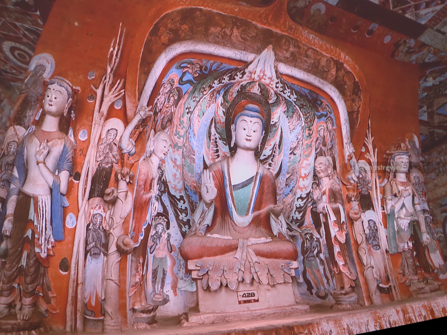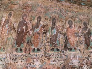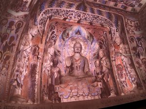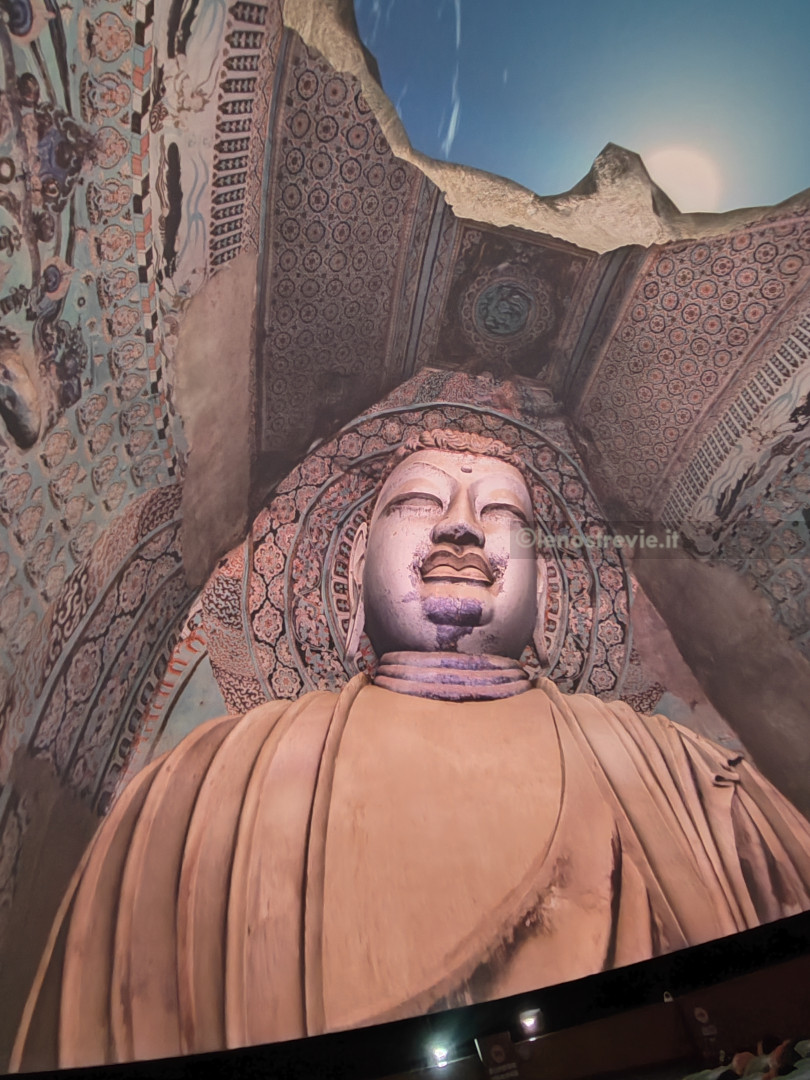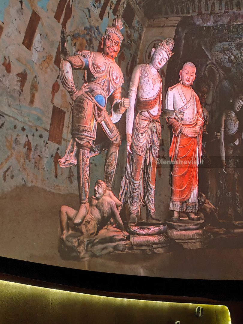 Come al solito è tutto superorganizzato. Entriamo nell’atrio e veniamo accodati ad una lunghissima fila (la prima di varie che incontreremo) per andare a vedere due documentari sulle grotte. A un certo punto sbucano dal nulla due inservienti che ci portano le cuffie per la traduzione simultanea (evidentemente si vede che non siamo cinesi). Alla fine entriamo nella sala di proiezione. I documentari raccontano l’origine e la storia delle grotte, mostrando da vicino le statue e gli affreschi d’epoca compresa tra il IV e il XIV secolo.