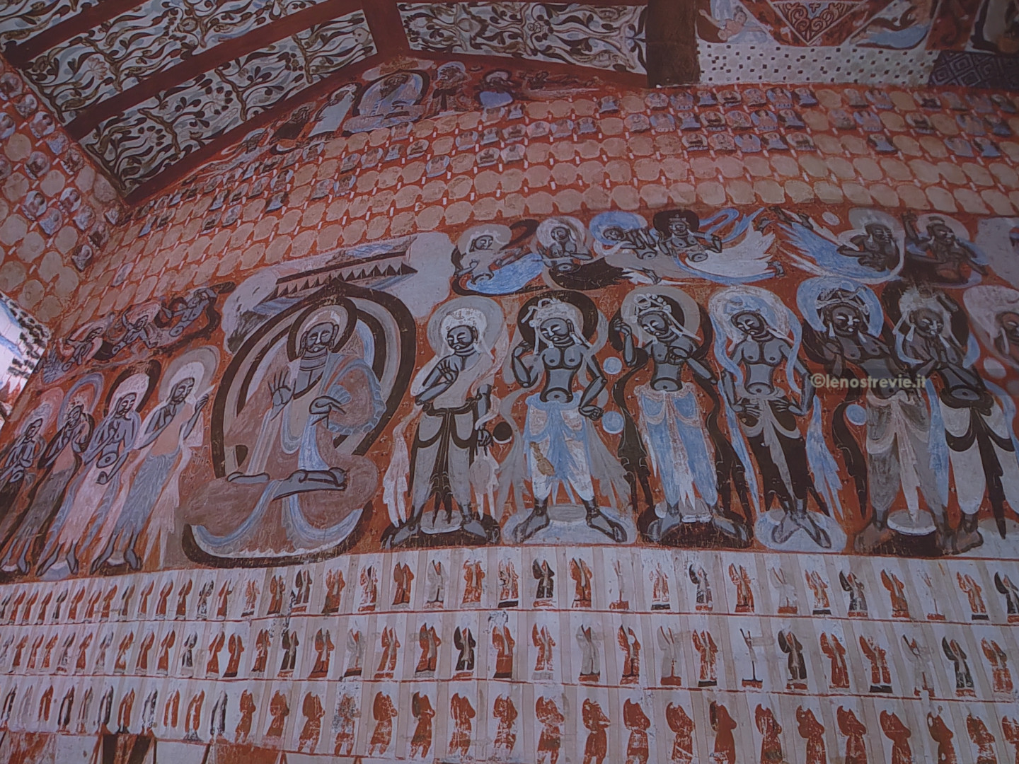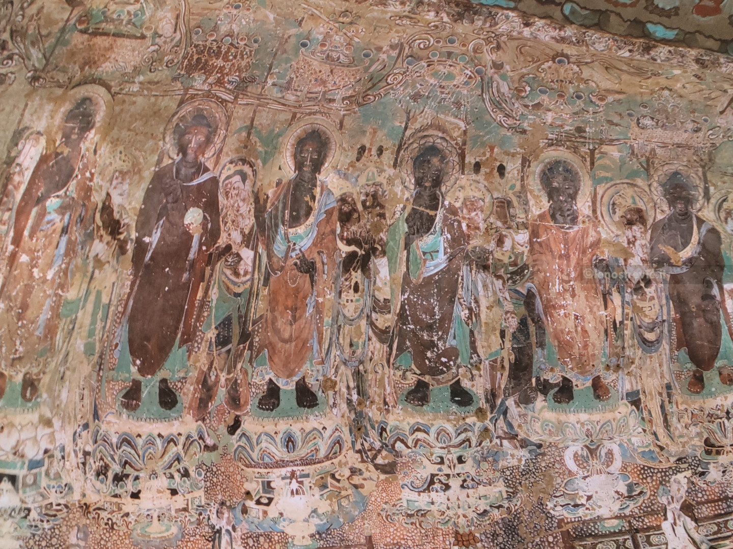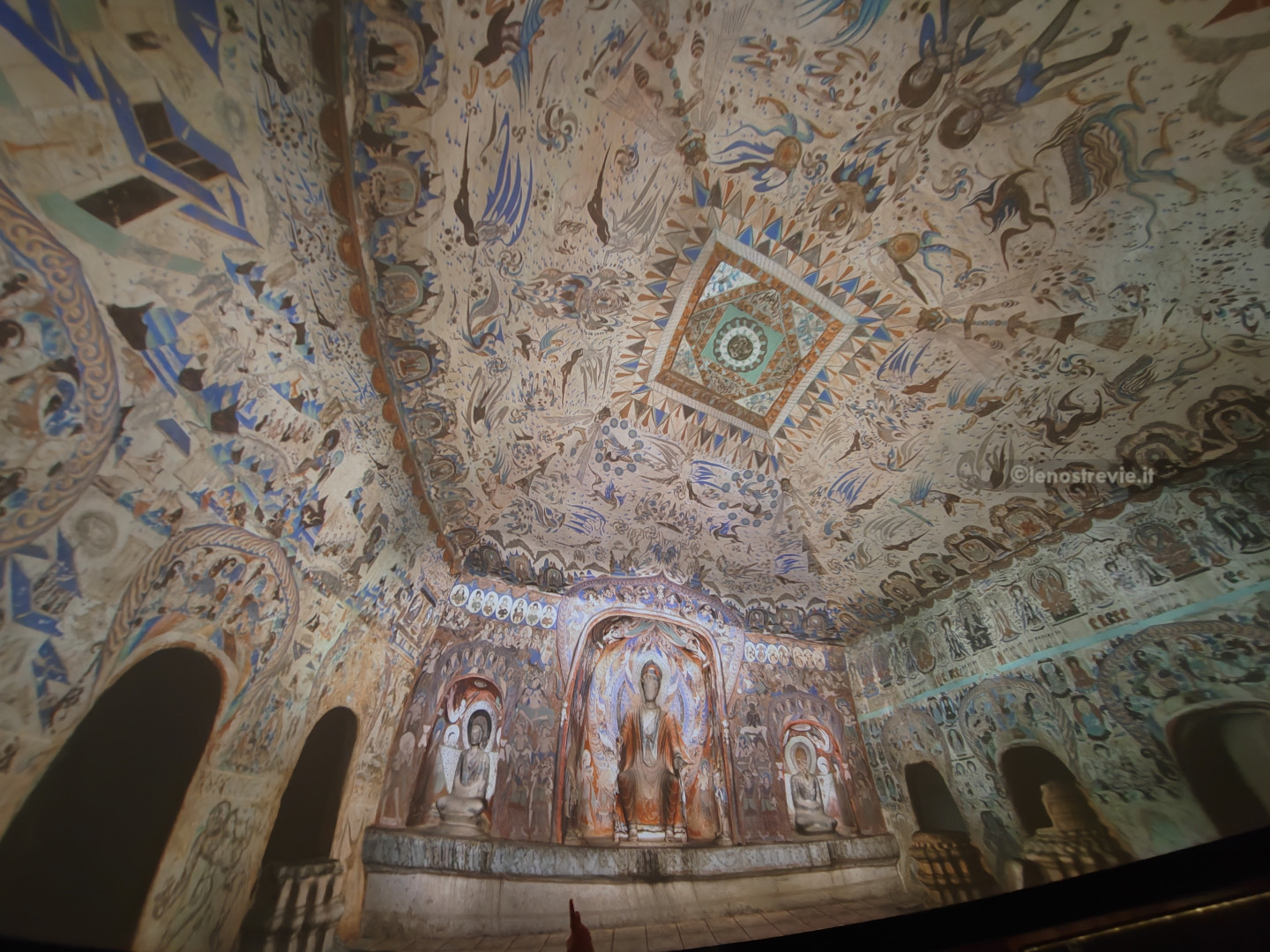Come al solito è tutto superorganizzato. Entriamo nell’atrio e veniamo accodati ad una lunghissima fila (la prima di varie che incontreremo) per andare a vedere due documentari sulle grotte. A un certo punto sbucano dal nulla due inservienti che ci portano le cuffie per la traduzione simultanea (evidentemente si vede che non siamo cinesi). Alla fine entriamo nella sala di proiezione. I documentari raccontano l’origine e la storia delle grotte, mostrando da vicino le statue e gli affreschi d’epoca compresa tra il IV e il XIV secolo.