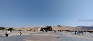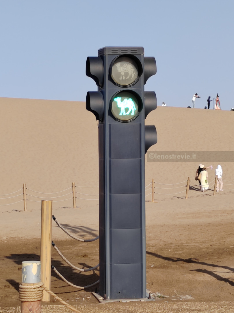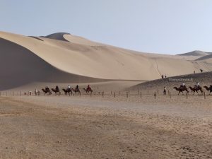 La mattina dopo, il 13 settembre, andiamo a fare colazione (valida anche se esclusivamente di tipo cinese) sul rooftop dell’albergo. L’aria esterna è piuttosto fredda. Restiamo di stucco quando dalla terrazza vediamo che poco più in là, dove la città finisce iniziano direttamente le alte dune del deserto.