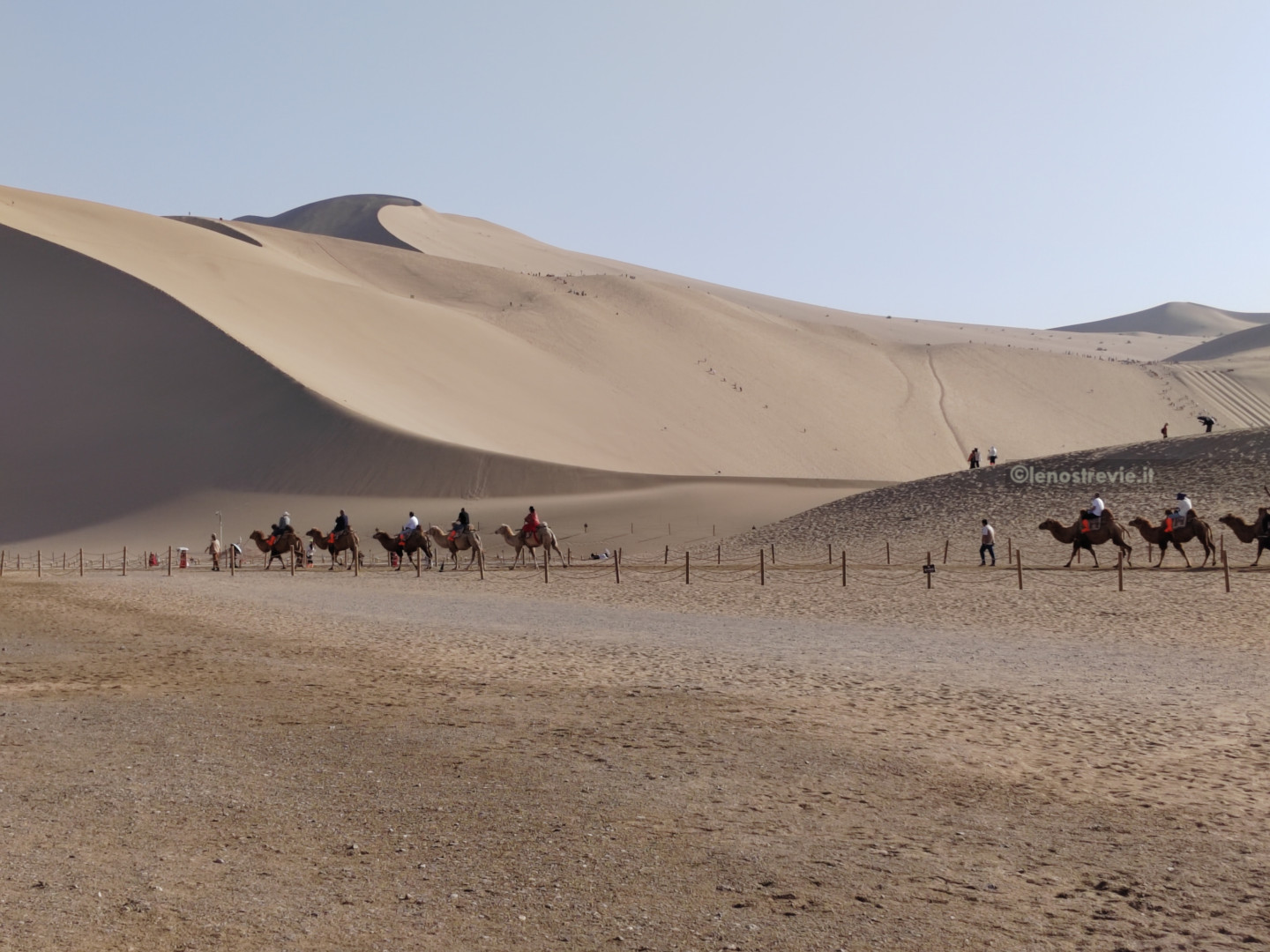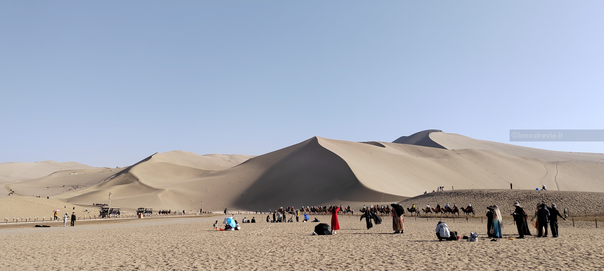 Il luogo è spettacolare: enormi dune, alte un centinaio di metri appaiono davanti e vicinissime. Purtroppo è pieno di gente che fa di tutto: scala le dune, va in carovana sui cammelli, si fa fare le foto con il solito costume locale, va su trenini turistici.