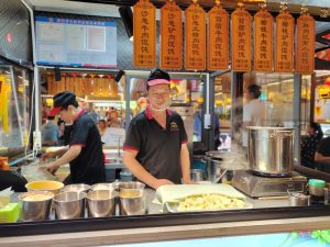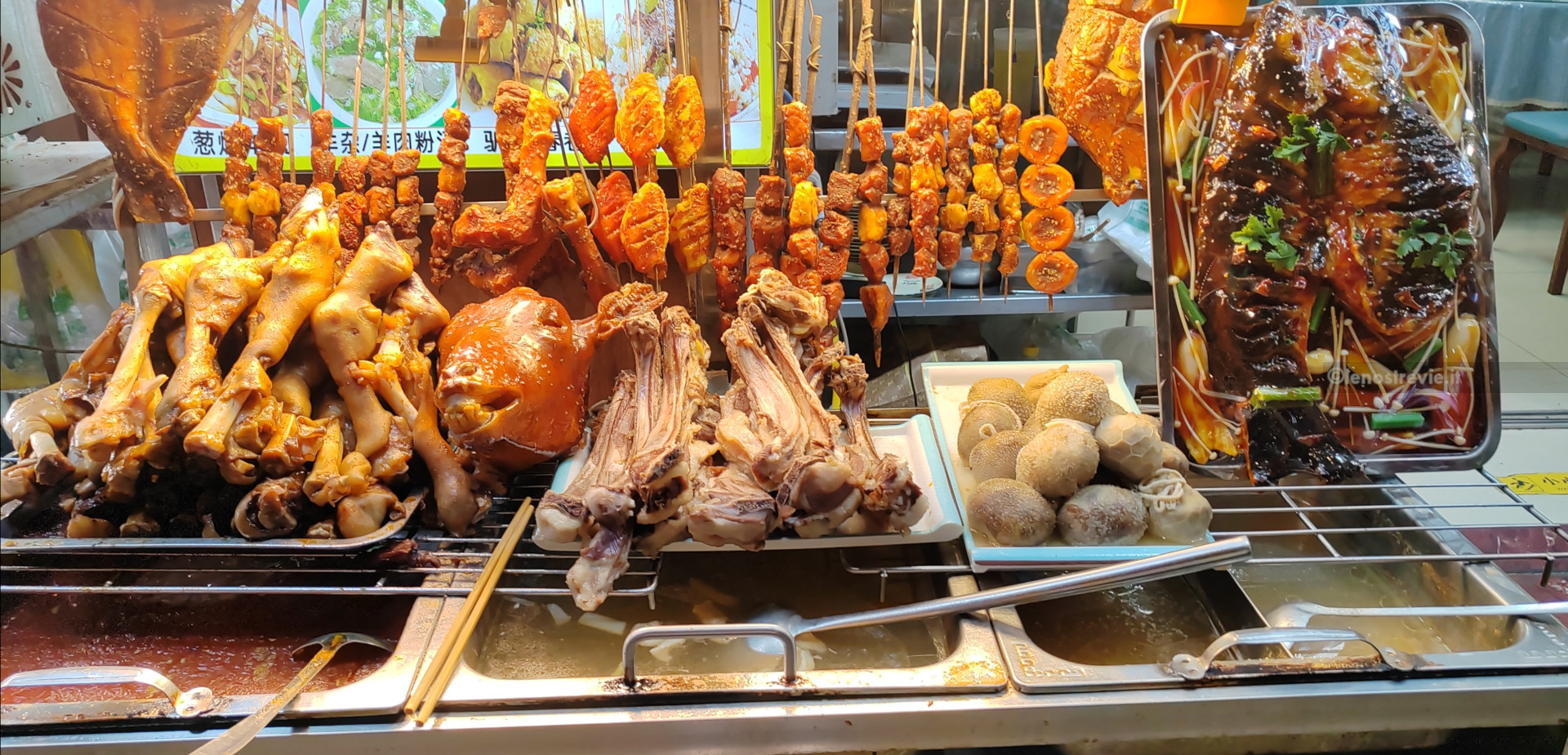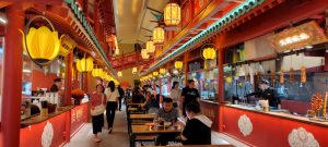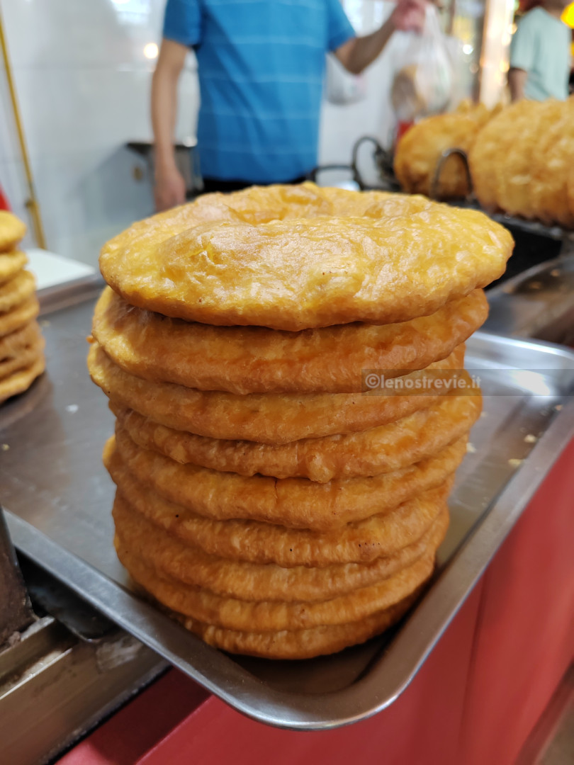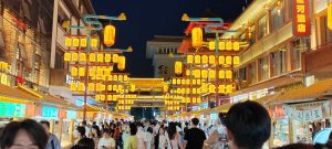 Fortunatamente siamo già in centro, nella zona pedonale, adiacente alla “food street“, animatissima, e piena di luci e piccoli banchetti e/o ristorantini dove prendere tutte le specialità locali. Troviamo ottimi wantong in brodo. Al termine ne approfittiamo per fare un giro della zona, piena di gente (cinese) con addirittura uno spettacolo di canto da un balcone. Il tutto sotto il vigile controllo di un poliziotto su una postazione rialzata.