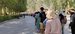 Usciamo per cercare l’autobus per le Grotte Mogao (UNESCO). O meglio per la biglietteria delle grotte che si trova da tutt’altra parte, dove dobbiamo ritirare i biglietti acquistati on line. Dopo qualche vicissitudine troviamo la navetta, come al solito efficientissima.