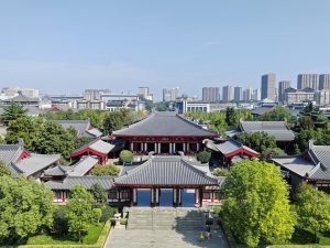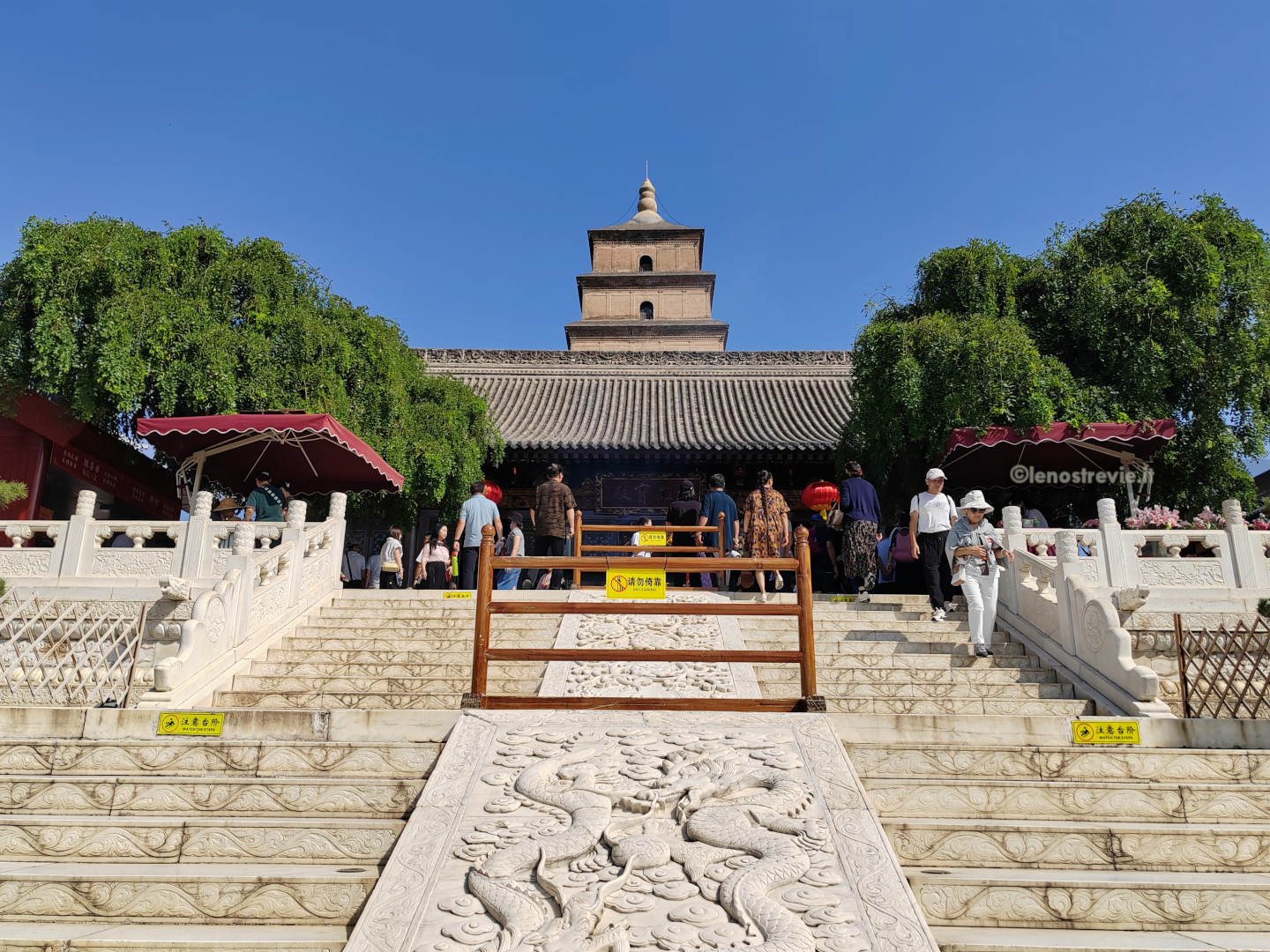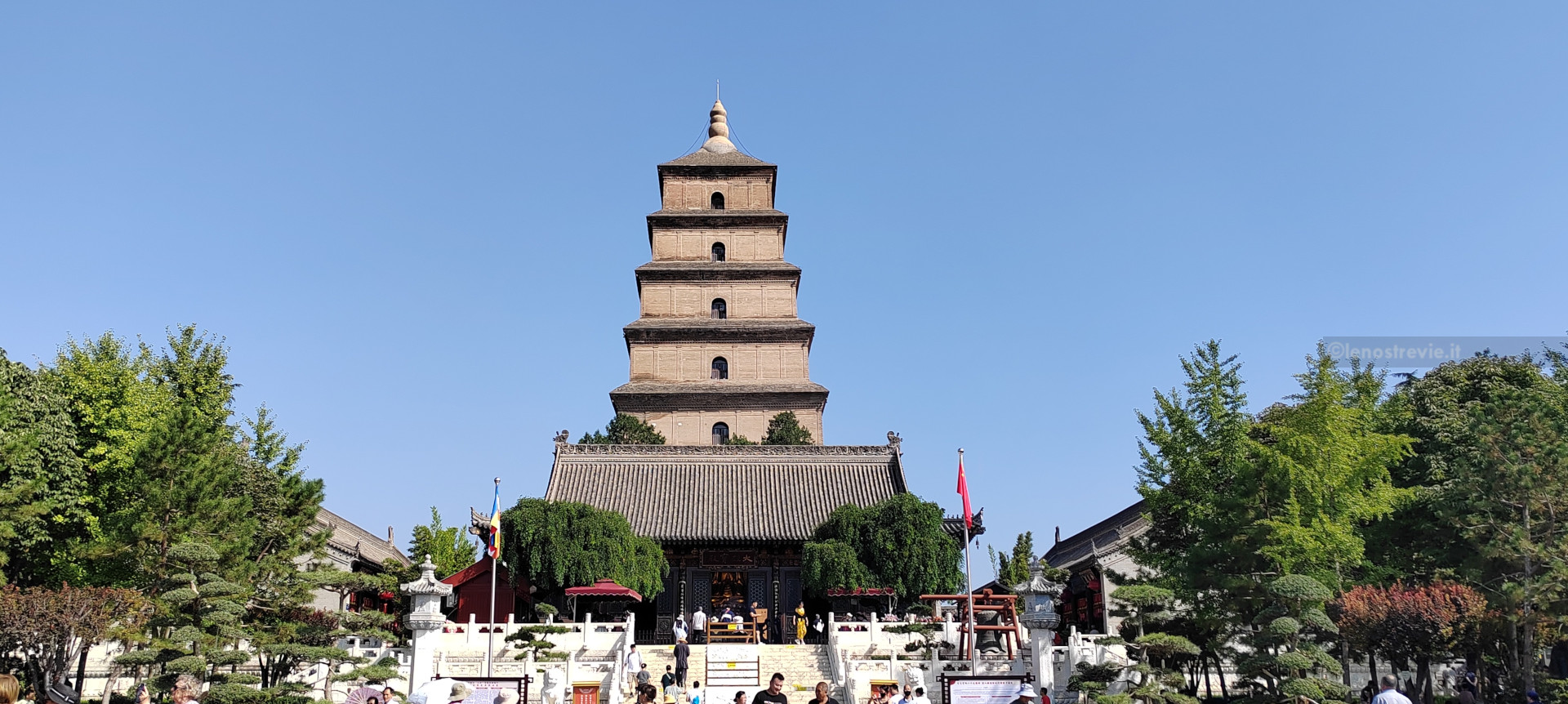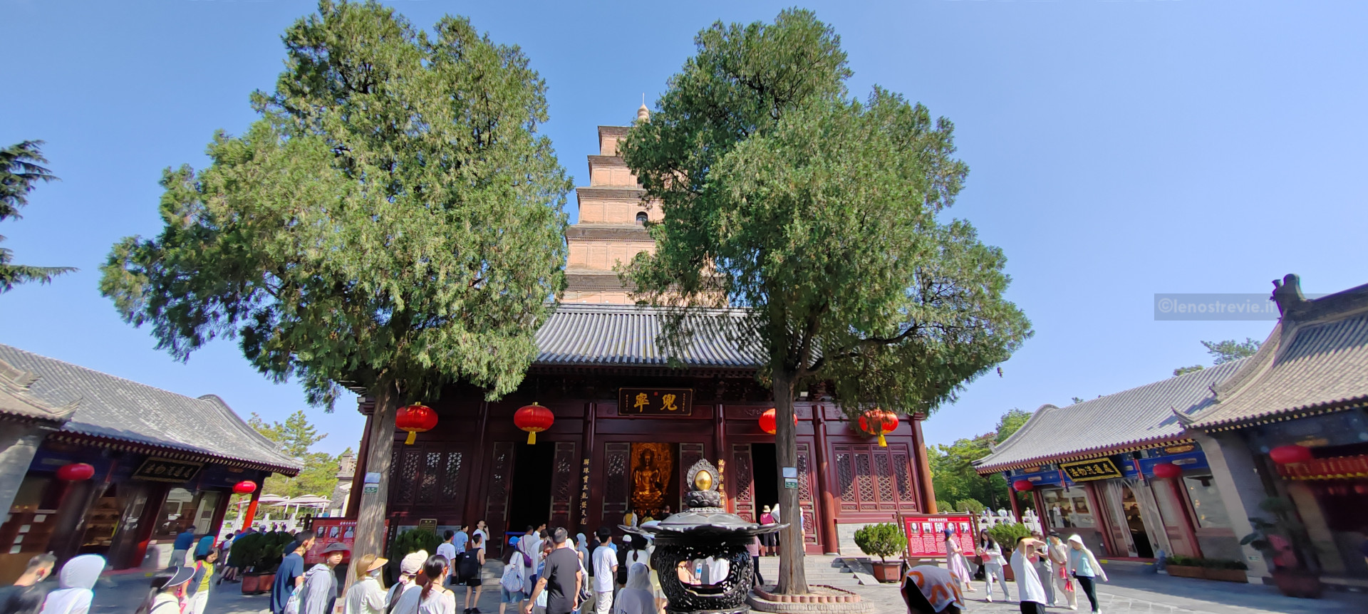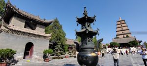 La pagoda è contenuta nell’area del Tempio Da Ci’en, un importante complesso buddista della Dinastia Tang, fondato nel 648. Nelle varie strutture che lo compongono ci sono rappresentazioni sacre, ed in uno si sta svolgendo una funzione con monaci e monache che cantano.