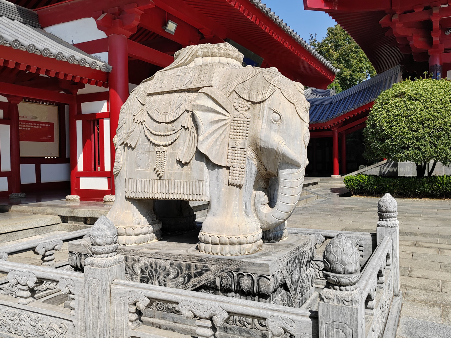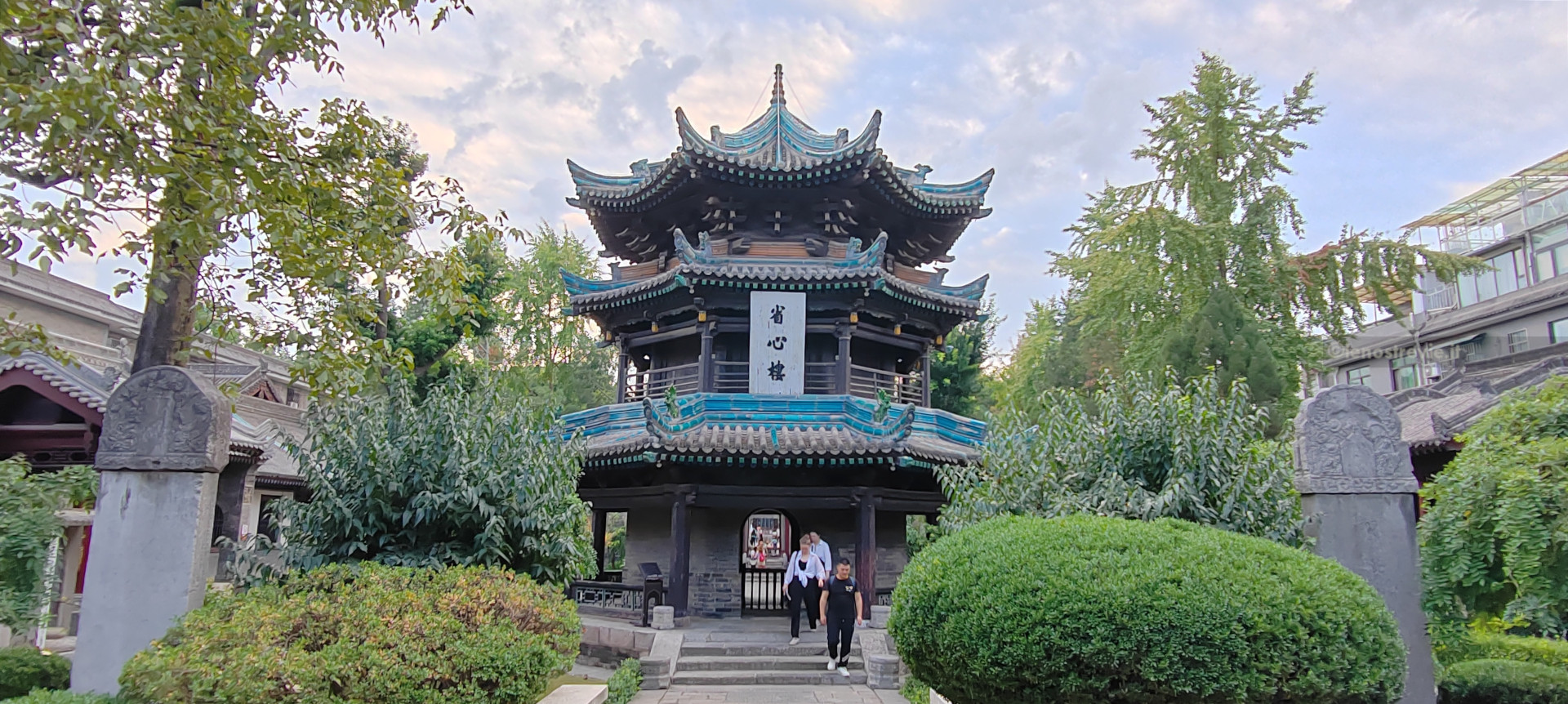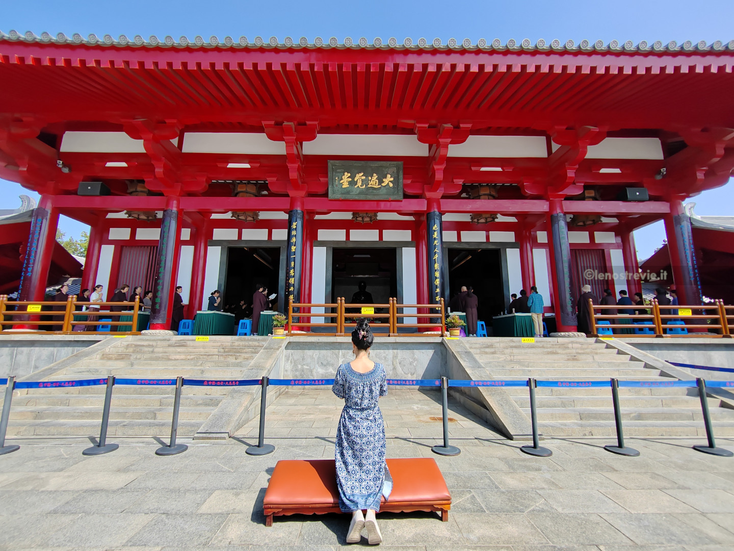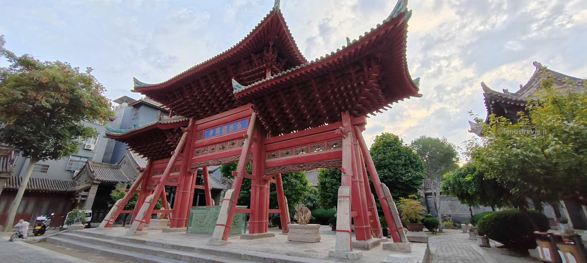 La pagoda è contenuta nell’area del Tempio Da Ci’en, un importante complesso buddista della Dinastia Tang, fondato nel 648. Nelle varie strutture che lo compongono ci sono rappresentazioni sacre, ed in uno si sta svolgendo una funzione con monaci e monache che cantano.