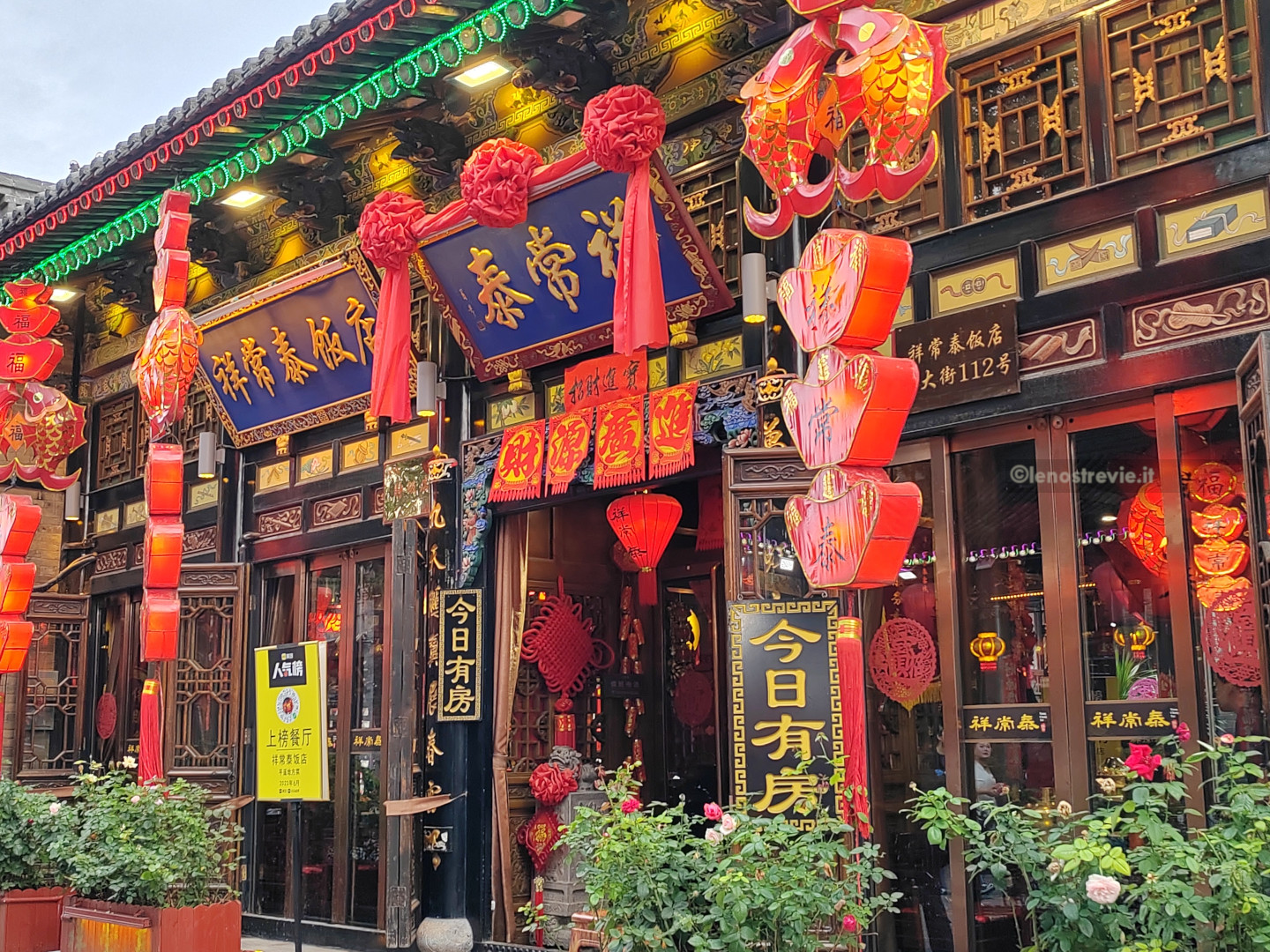 Varchiamo la porta, oltre la quale sappiamo essere il nostro albergo. Dopo qualche verifica scopriamo che è all’interno del ristorante annesso, con insegne in cinese, quindi di non facile individuazione.