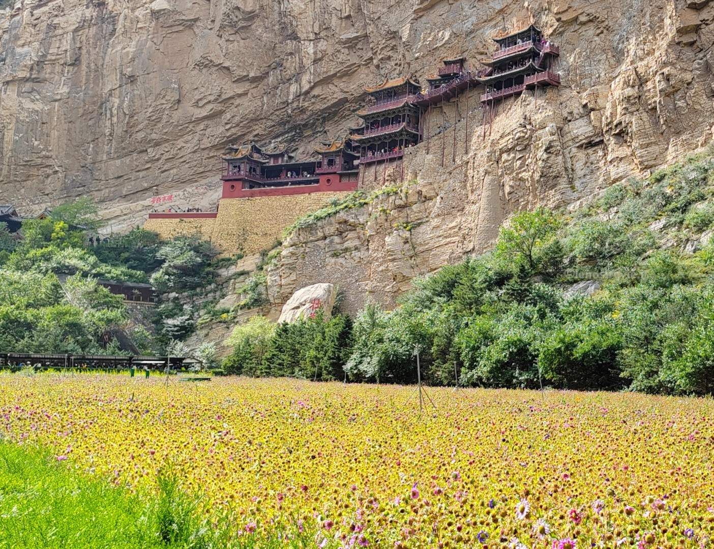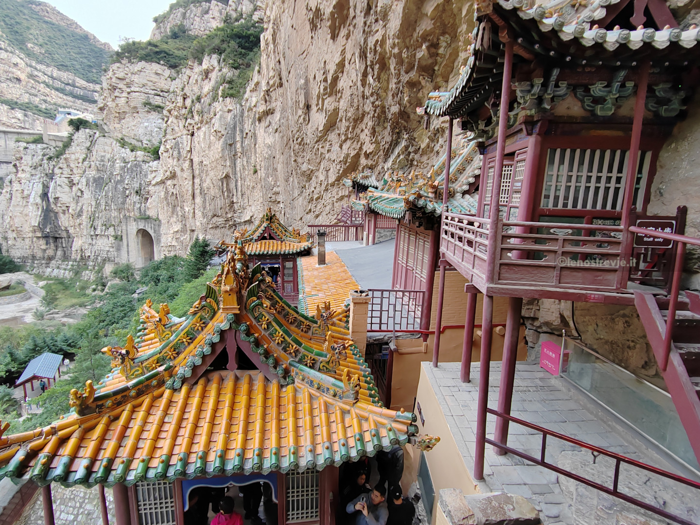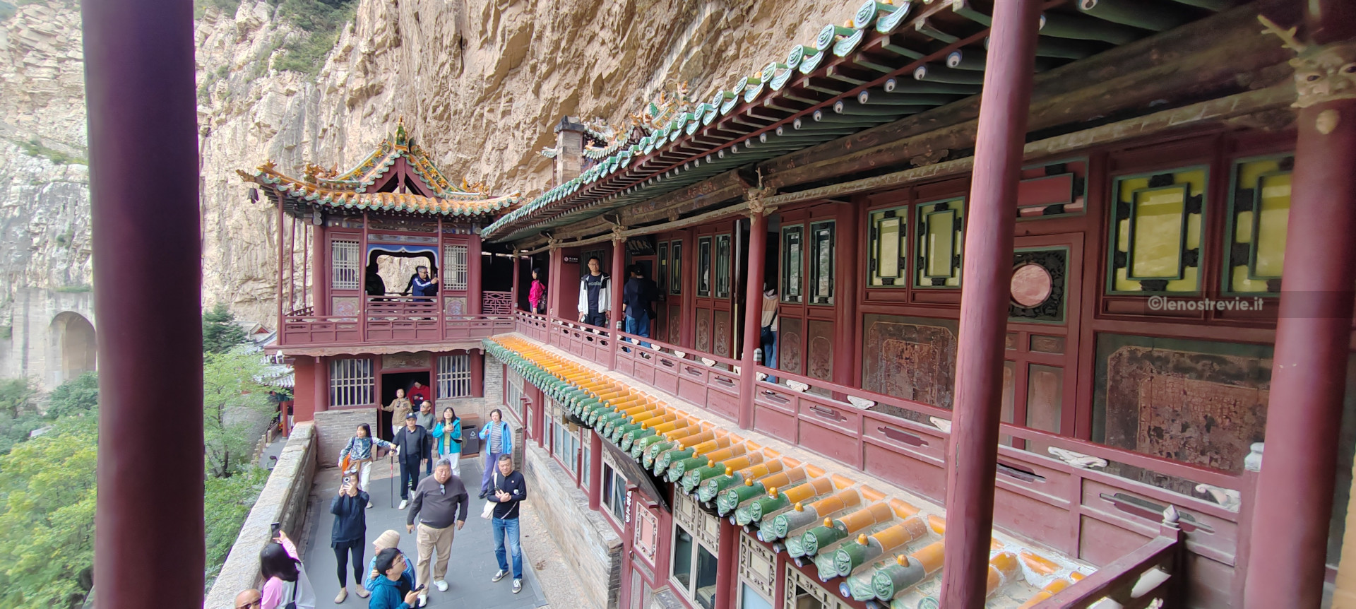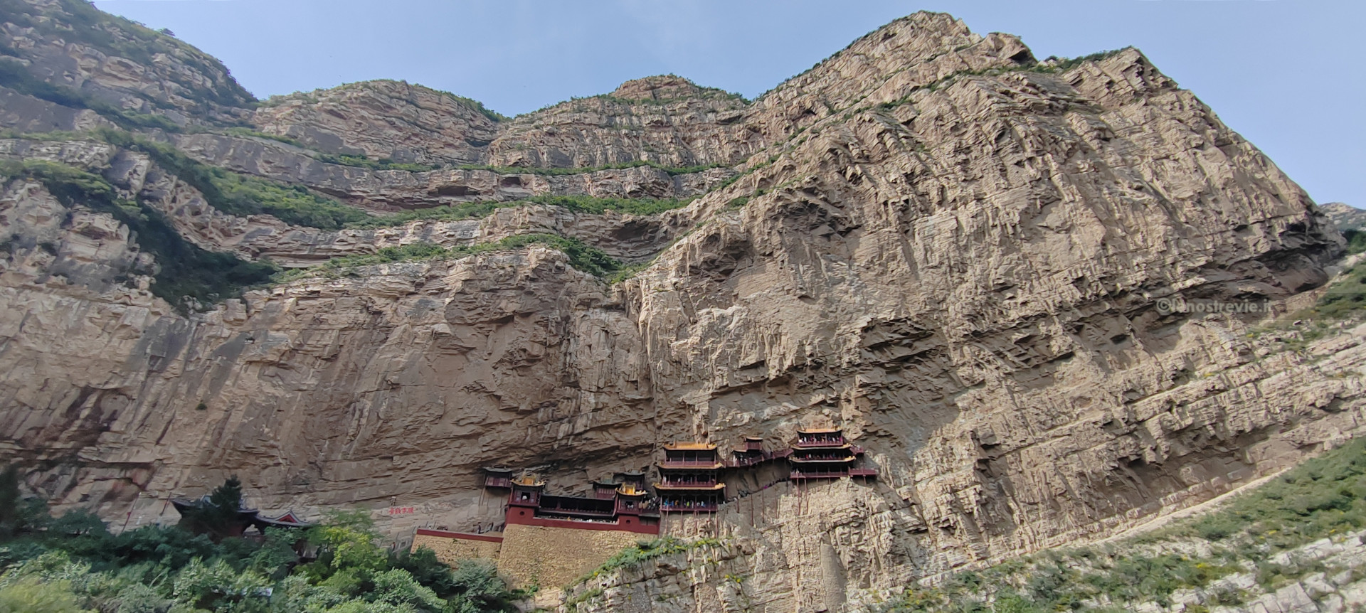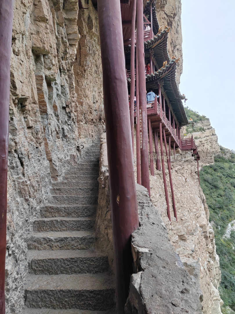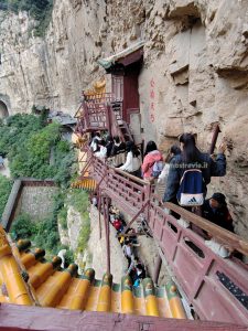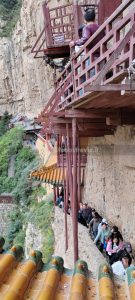Il tempio è letteralmente aggrappato alla parete della montagna, sostenuto da pali di legno, e appare nel suo insieme fragile.