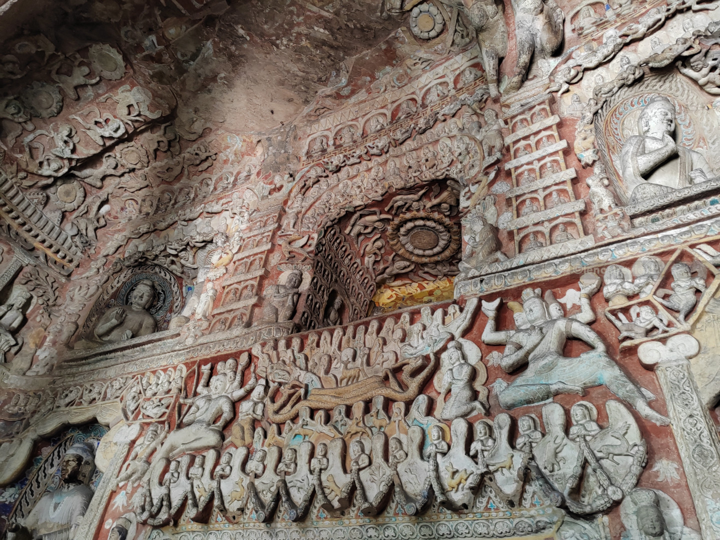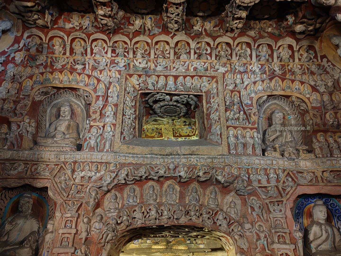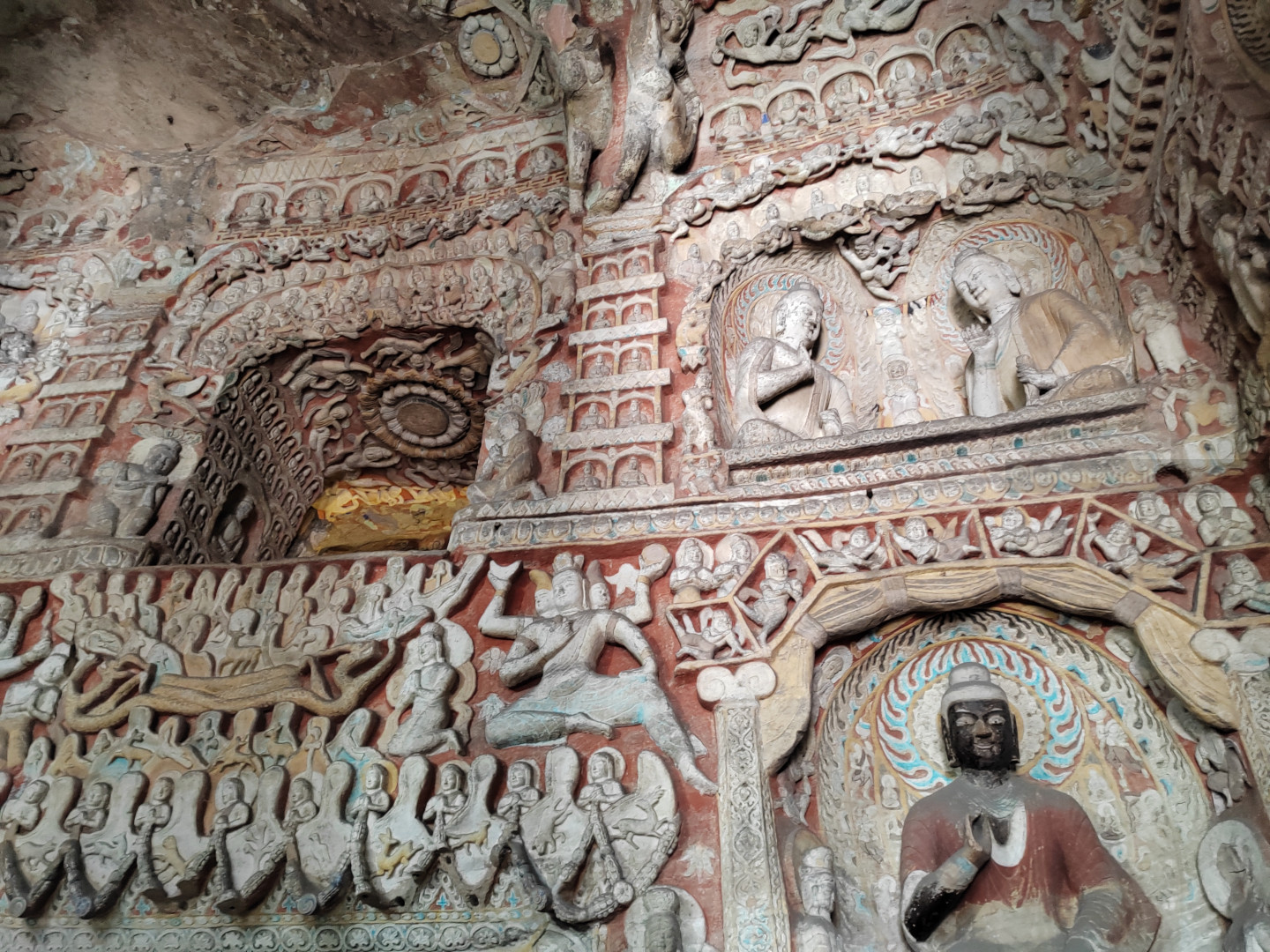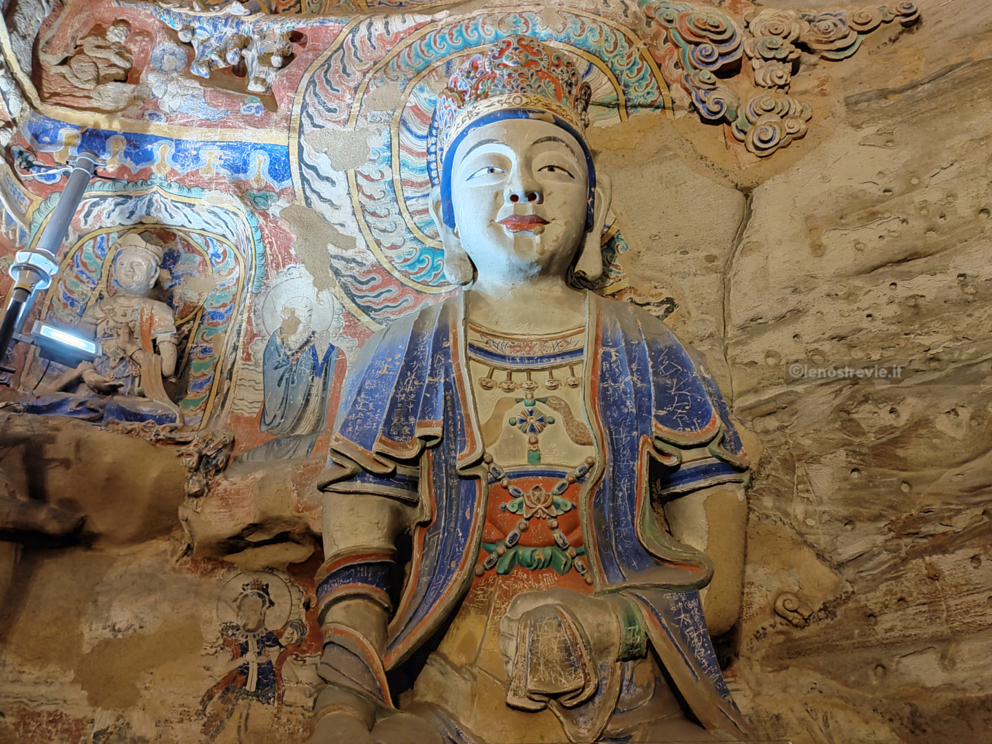 Il sito è bellissimo, colorato e imponente, molto più bello (a nostro parere) delle sopravvalutate grotte di Mogao. Le grotte sono enormi, con bassorilievi e affreschi ancora ben tenuti, e statue gigantesche di Buddha scavate nella roccia.
